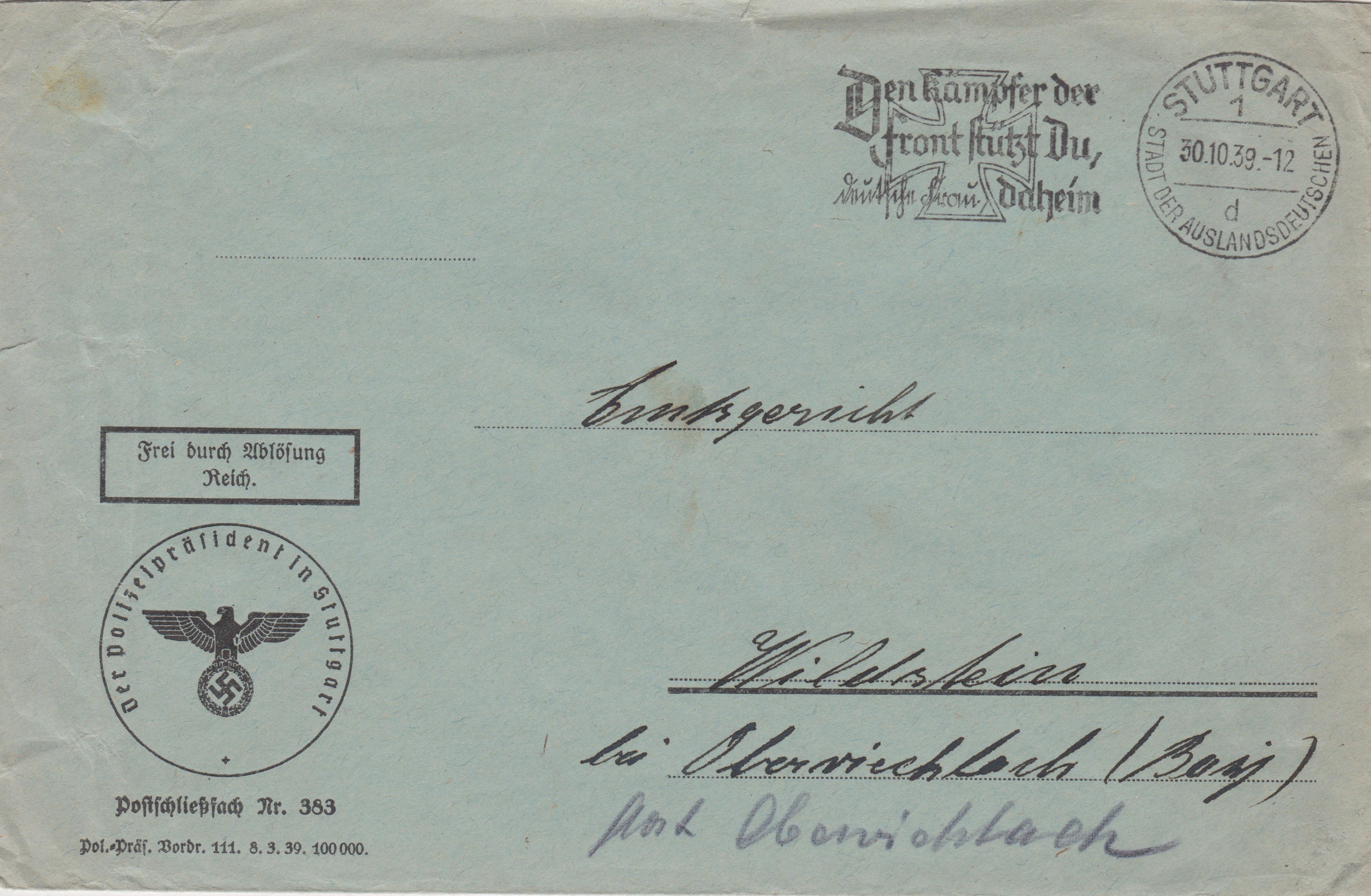 Dieser an das "Amtsgericht" in "Wildstein bei Oberviechtach" in Bayern adressierte Brief vom Absender "Der Polizeipräsident in Stuttgart" wurde am 30.10.1939 "Frei durch Ablösung Reich", daher ohne Frankatur, in STUTTGART 1 aufgegeben und erhielt einen Maschinenstempel "STUTTGART 1 d STADT DER AUSLANDSDEUTSCHEN" mit Werbeeinsatz "Den Kämpfer der Front stützt Du, deutsche Frau daheim":