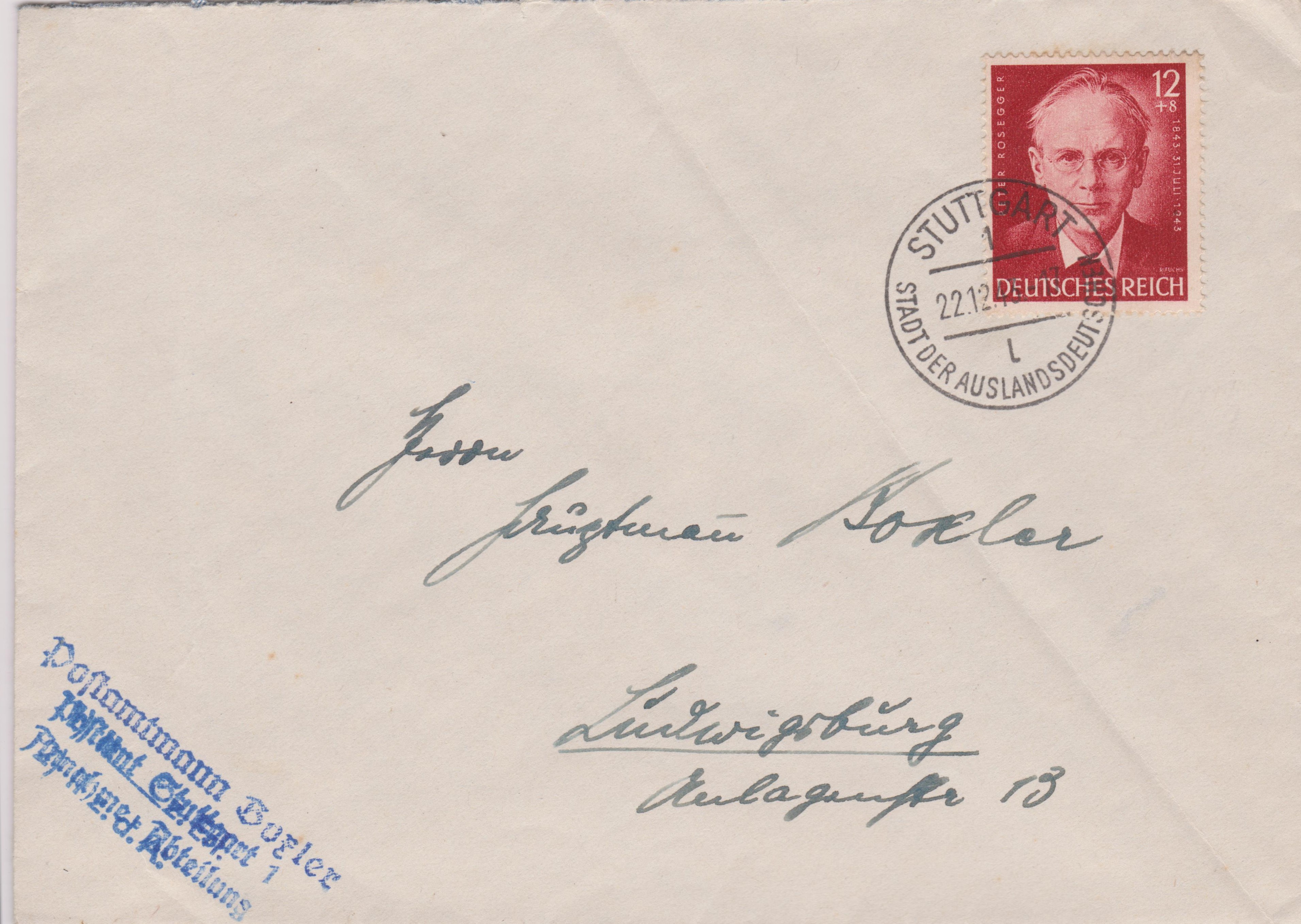 Dieser Brief im Fernverkehr nach Ludwigsburg, Portostufe 12 Pfennig, wurde am 22.12.1943 gestempelt in "STUTTGART 1 L STADT DER AUSLANDSDEUTSCHEN":