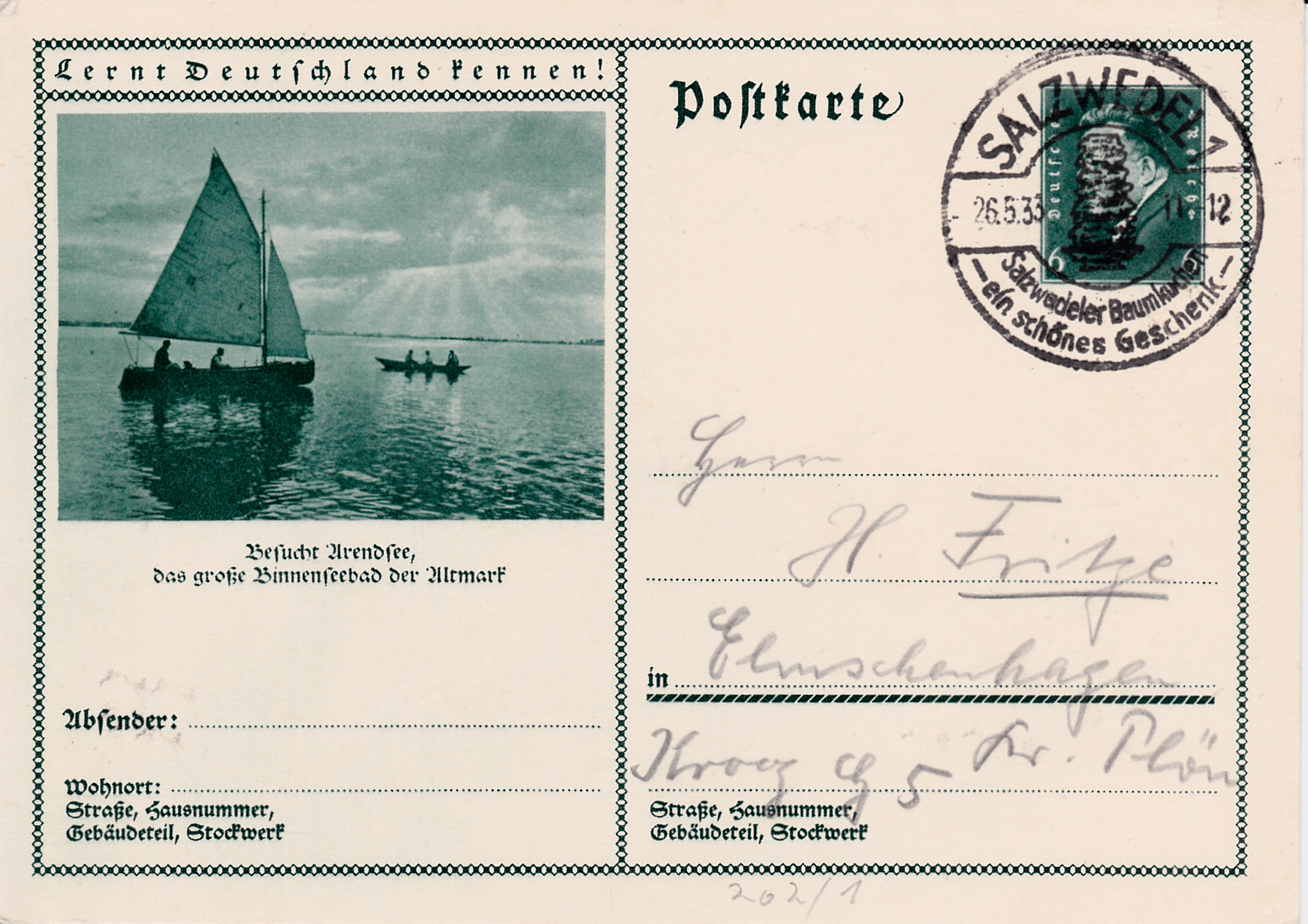 Ich beginne hier mit dieser Karte (MiNr P 202/01), die mit einem Foto mit dem Arendsee zum Besuch von Arendsee (Altmark) wirbt.