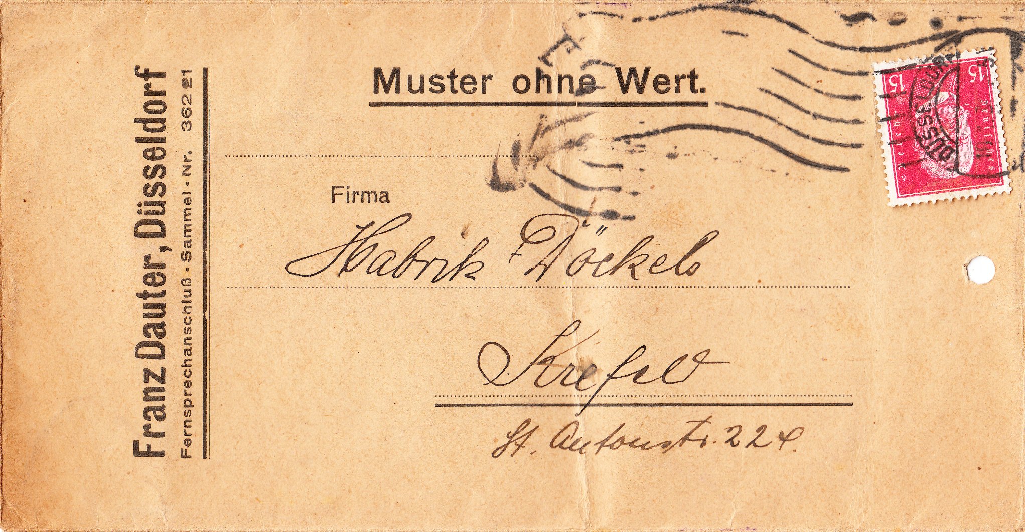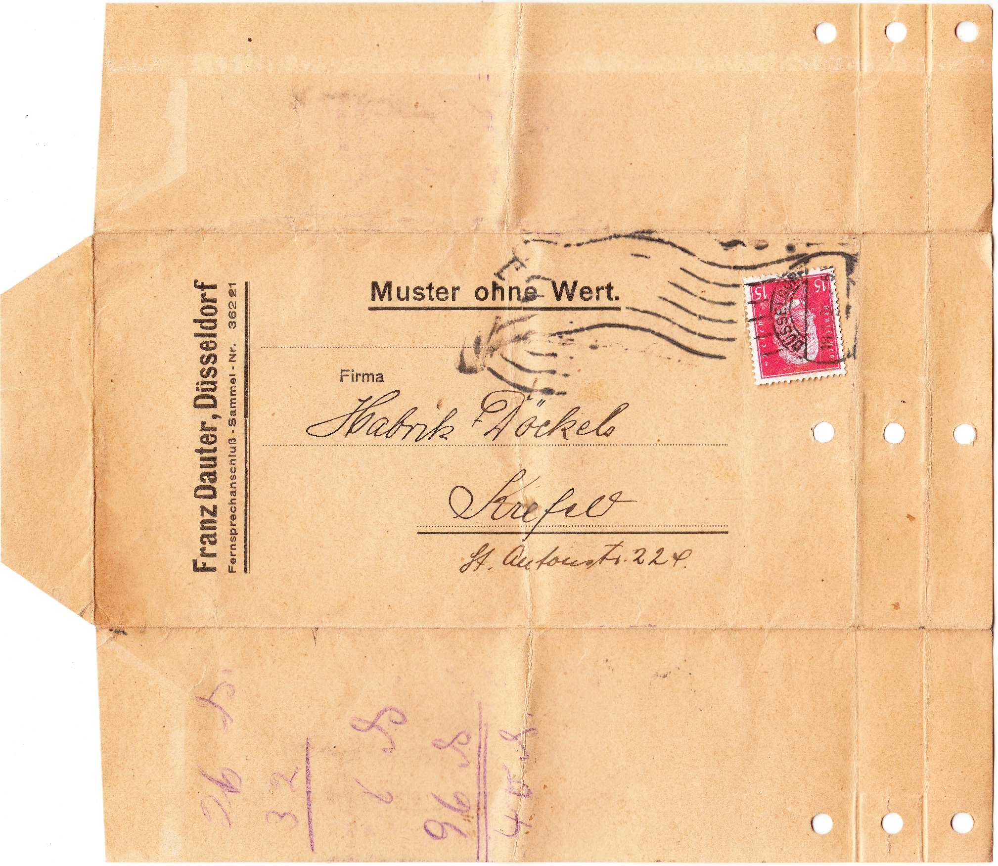In diesem Falle hatte sich die Firma Franz Dauter, Düsseldorf extra Versandtaschen mit dem Vermerk "Muster ohne Wert." drucken lassen, die durch Faltung zu einer offenen Sendung wurden, die mit einer Metallklammer verschlossen werden konnte: