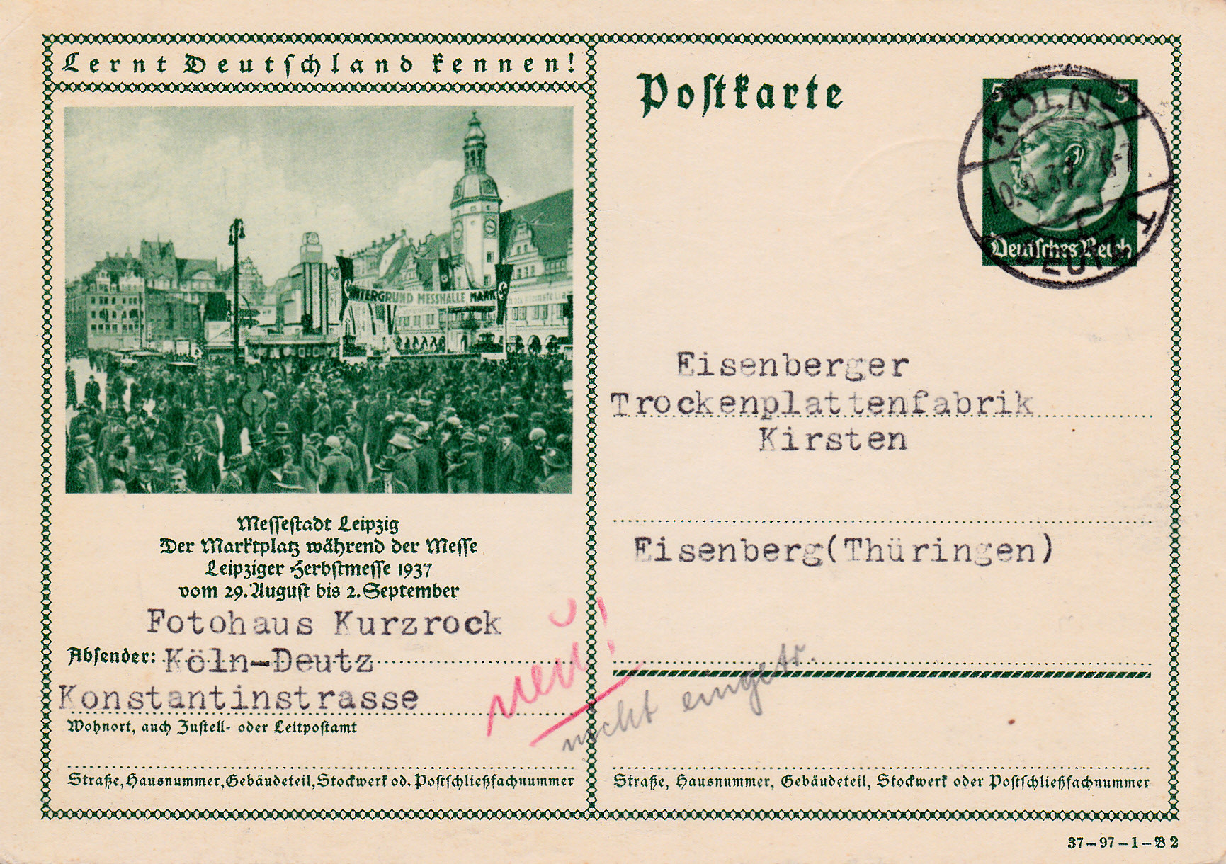 Auf dieser Karte sehen wir den Marktplatz von Leipzig während der Messe. Sie wirbt für die Leipziger Messe 1937. Die Karte wurde ohne zusätzliche Frankatur Köln nach Eisenberg (Thüringen) verschickt und auch nicht mit Nachporto belegt.