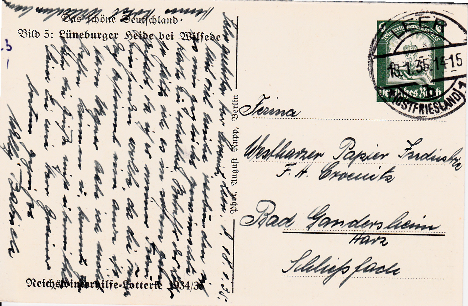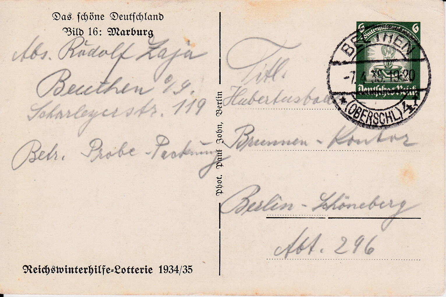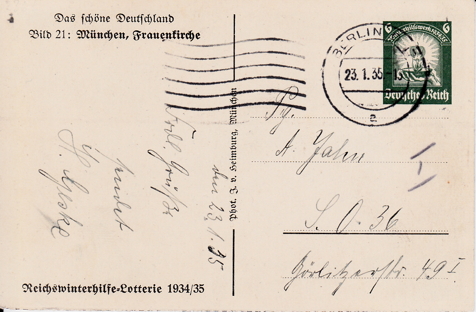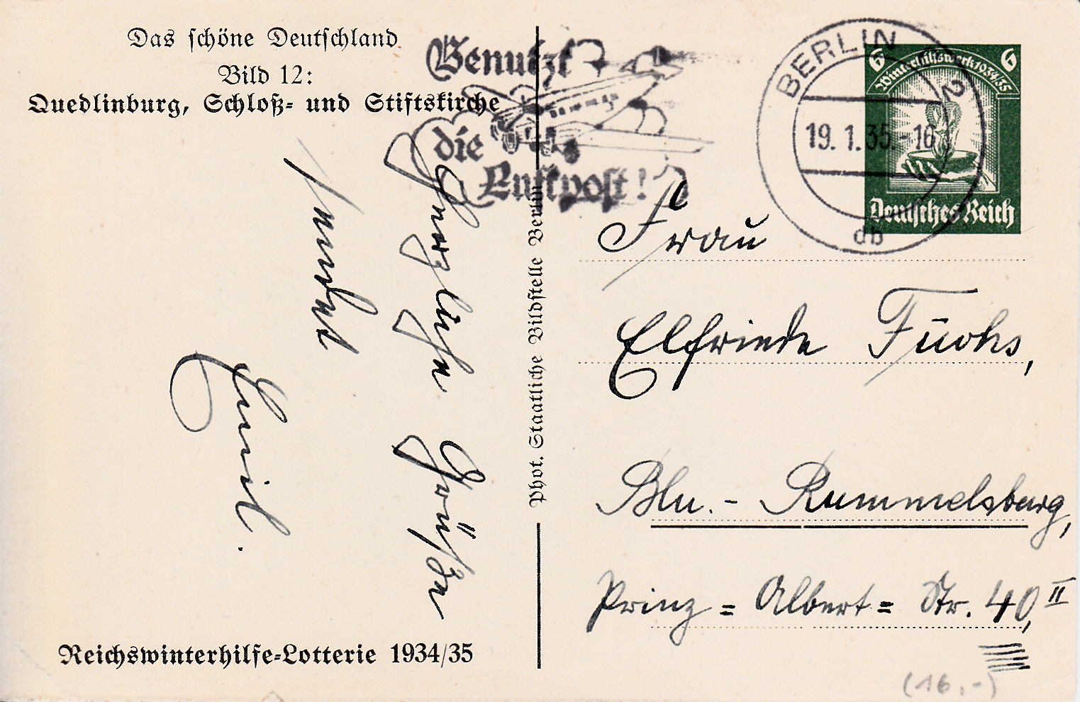 Diese Karte wind mit Vfg 430/1934 vom Reichspostministerium angekündigt worden und wurden zur Durchführung einer Postkarten-Lotterie verwendet. Das Los bestand aus einem Ansichtskartenpaar. Es wurde für 50Pf verkauft. Bei jeder zehnten Karte war auf einer der beiden Hälften ein Wertzeichen eingedruckt. Auf der Rückseite sind Ansichten von Gebäuden und Landschaften abgebildet. Es gibt insgesamt 200 verschiedene Bilder, also 100 Paare. Es gibt aber nur 82 Bilder regulär mit Wertstempel. Dazu kommen 22 Bilder mit "irrtümlichen" Wertstempel. Zur Postbeförderung waren nur abgetrennte Einzelkarten zugelassen, es gibt aber bedarfsmäßig gebrauchte Doppelkarten. Hier will ich alle 82 reguläre Postkarten mit Wertstempel zeigen.