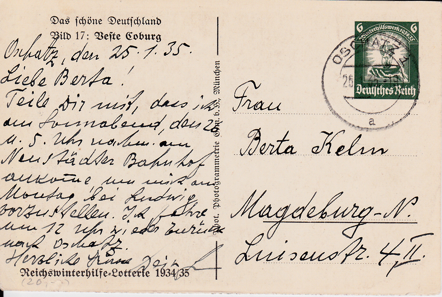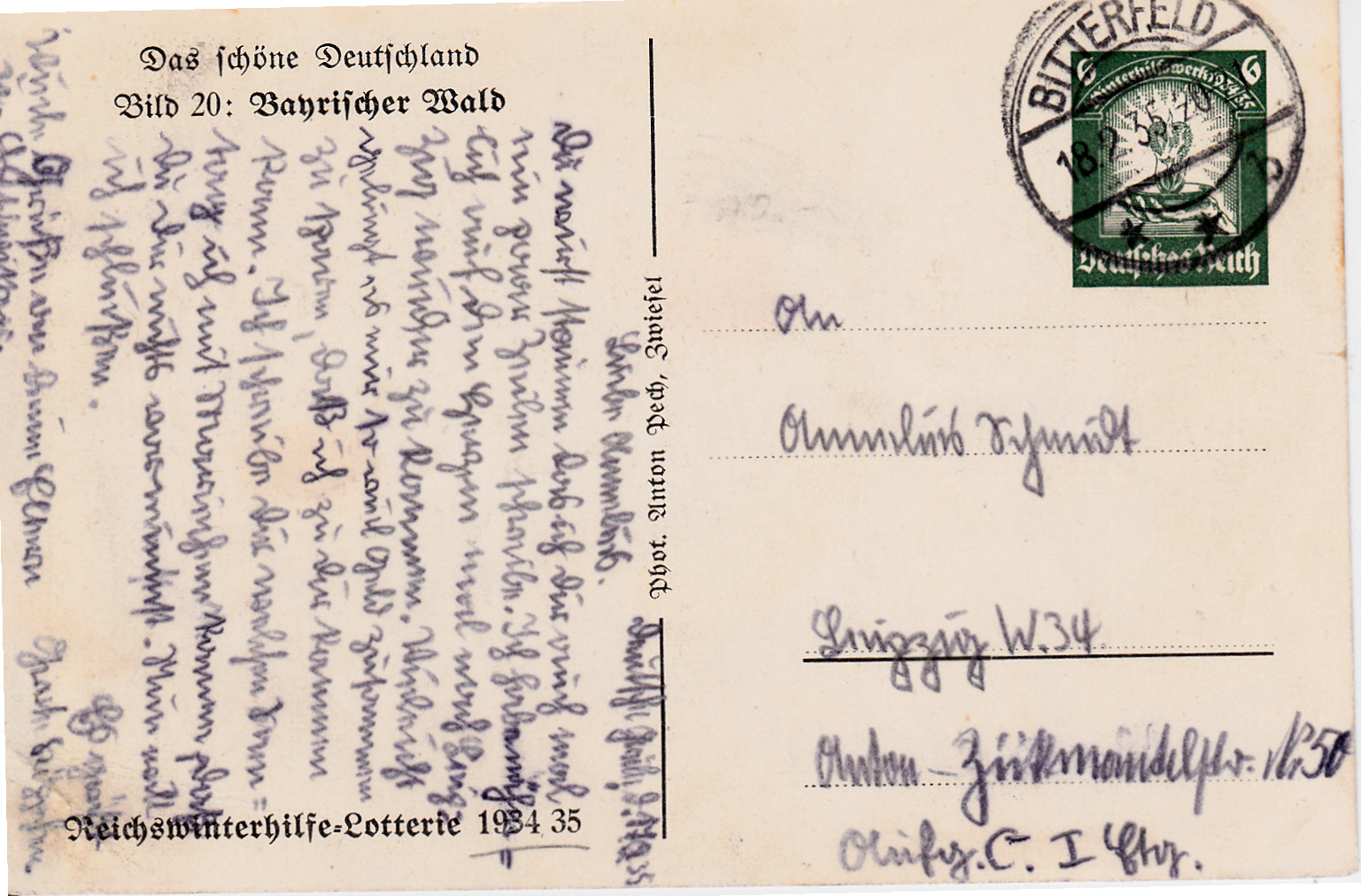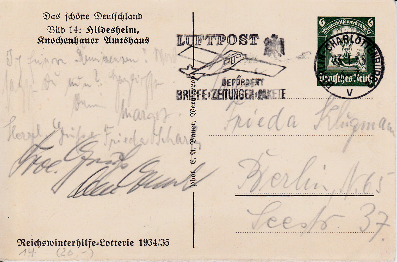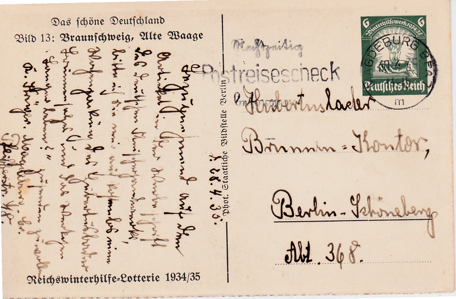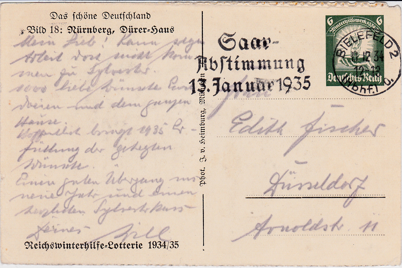 Diese Karte wind mit Vfg 430/1934 vom Reichspostministerium angekündigt worden und wurden zur Durchführung einer Postkarten-Lotterie verwendet. Das Los bestand aus einem Ansichtskartenpaar. Es wurde für 50Pf verkauft. Bei jeder zehnten Karte war auf einer der beiden Hälften ein Wertzeichen eingedruckt. Auf der Rückseite sind Ansichten von Gebäuden und Landschaften abgebildet. Es gibt insgesamt 200 verschiedene Bilder, also 100 Paare. Es gibt aber nur 82 Bilder regulär mit Wertstempel. Dazu kommen 22 Bilder mit "irrtümlichen" Wertstempel. Zur Postbeförderung waren nur abgetrennte Einzelkarten zugelassen, es gibt aber bedarfsmäßig gebrauchte Doppelkarten. Hier will ich alle 82 reguläre Postkarten mit Wertstempel zeigen.