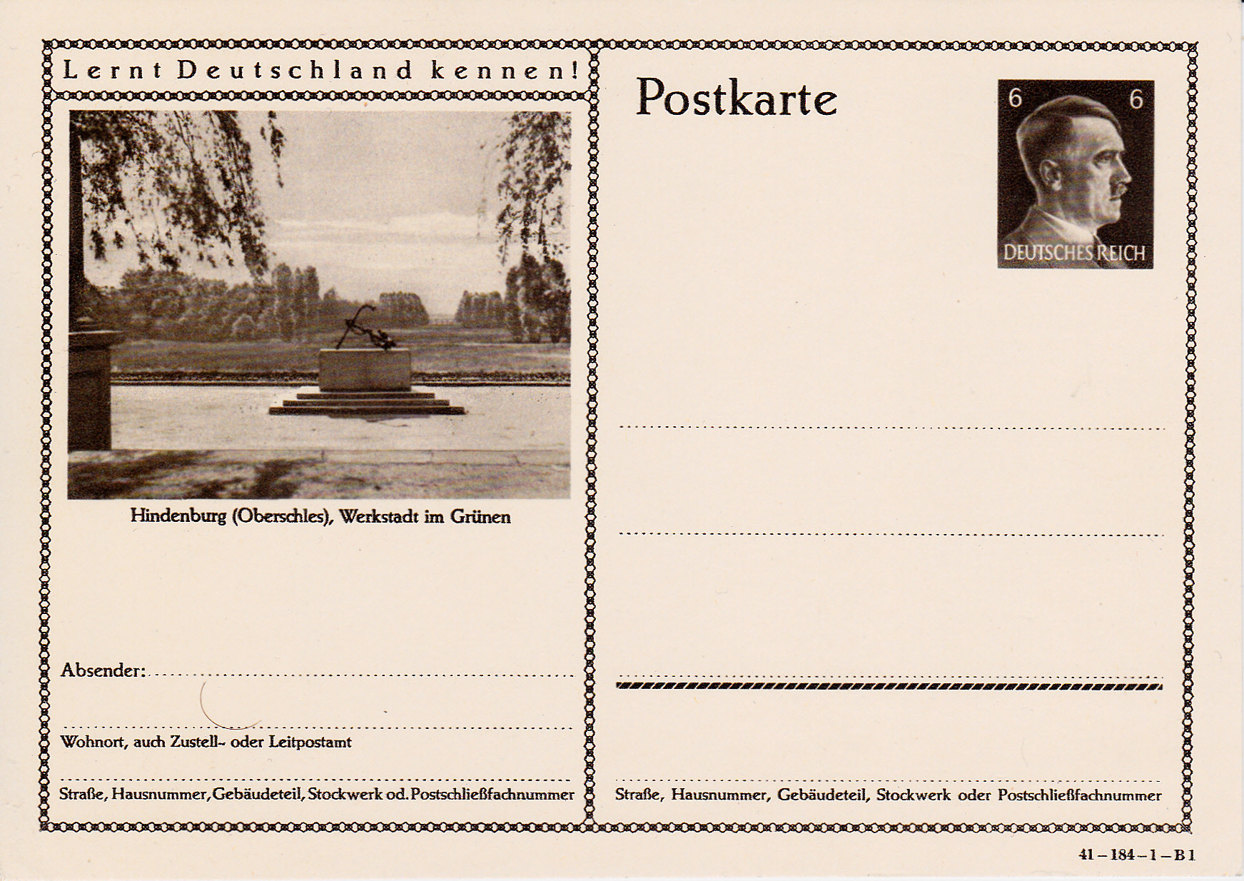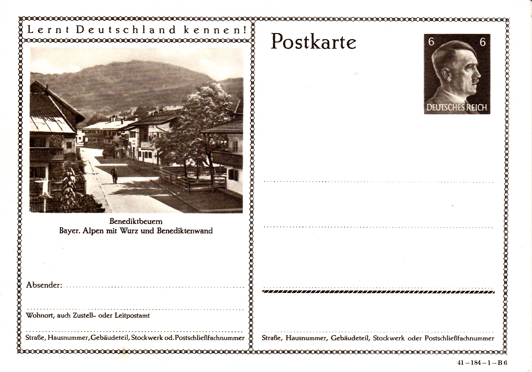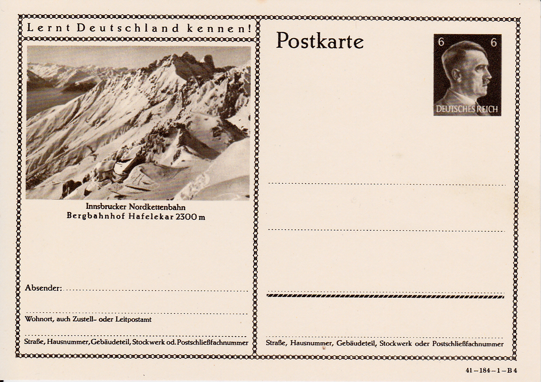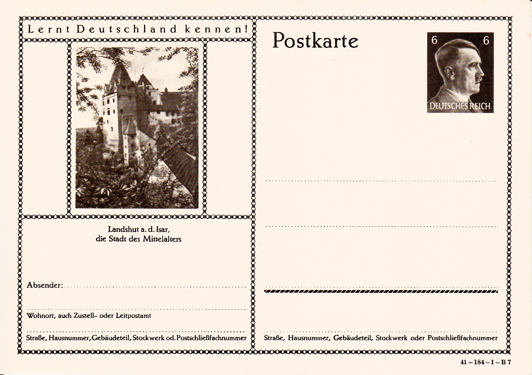 Ich beginne mit der Karte mit dem Druckvermerk 41-184-1-B1 (Ausgabejahr 1941-Serie 184-Druckplatte 1-Bild 1; bei weiteren Karten nenne ich jeweils die Serie und die Bildnummer, die Druckplattennummer nur, wenn es verschiedene Druckplattennummern bei der jeweiligen Serie gibt).