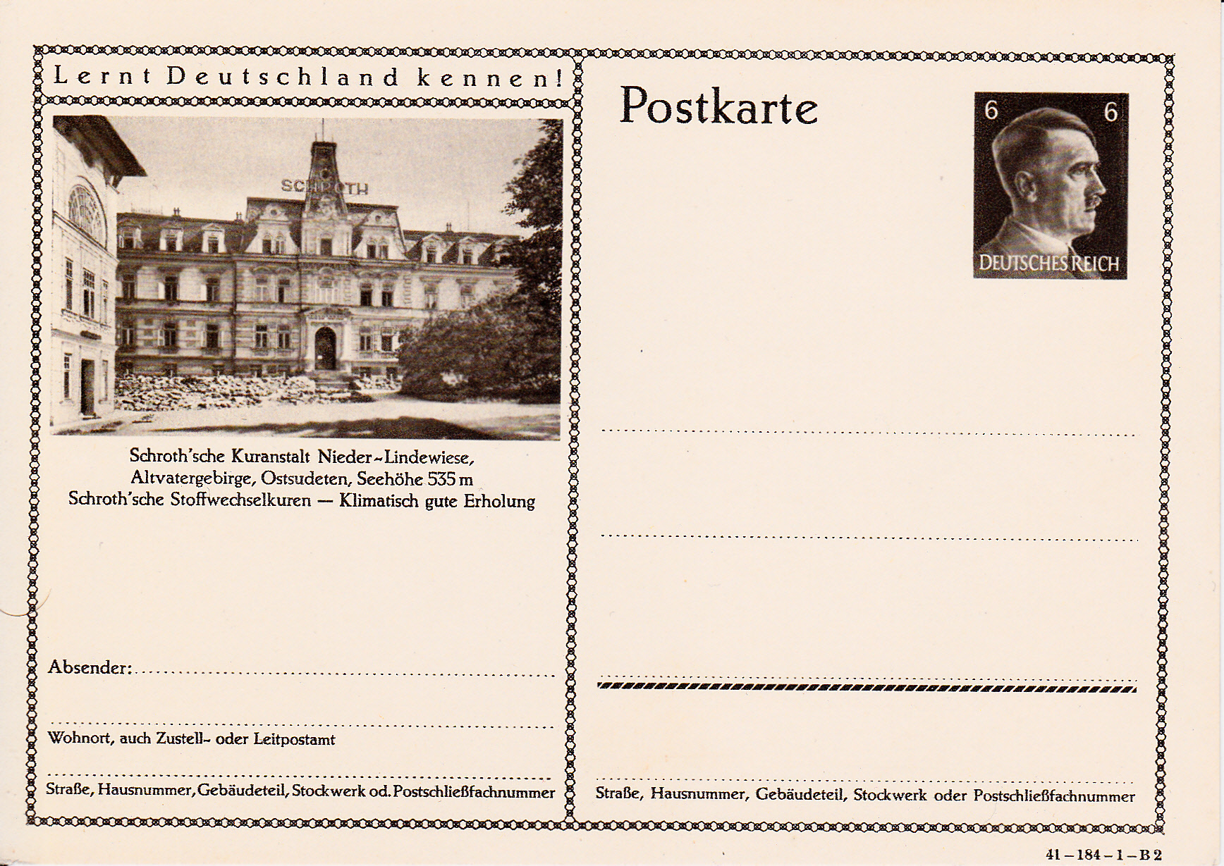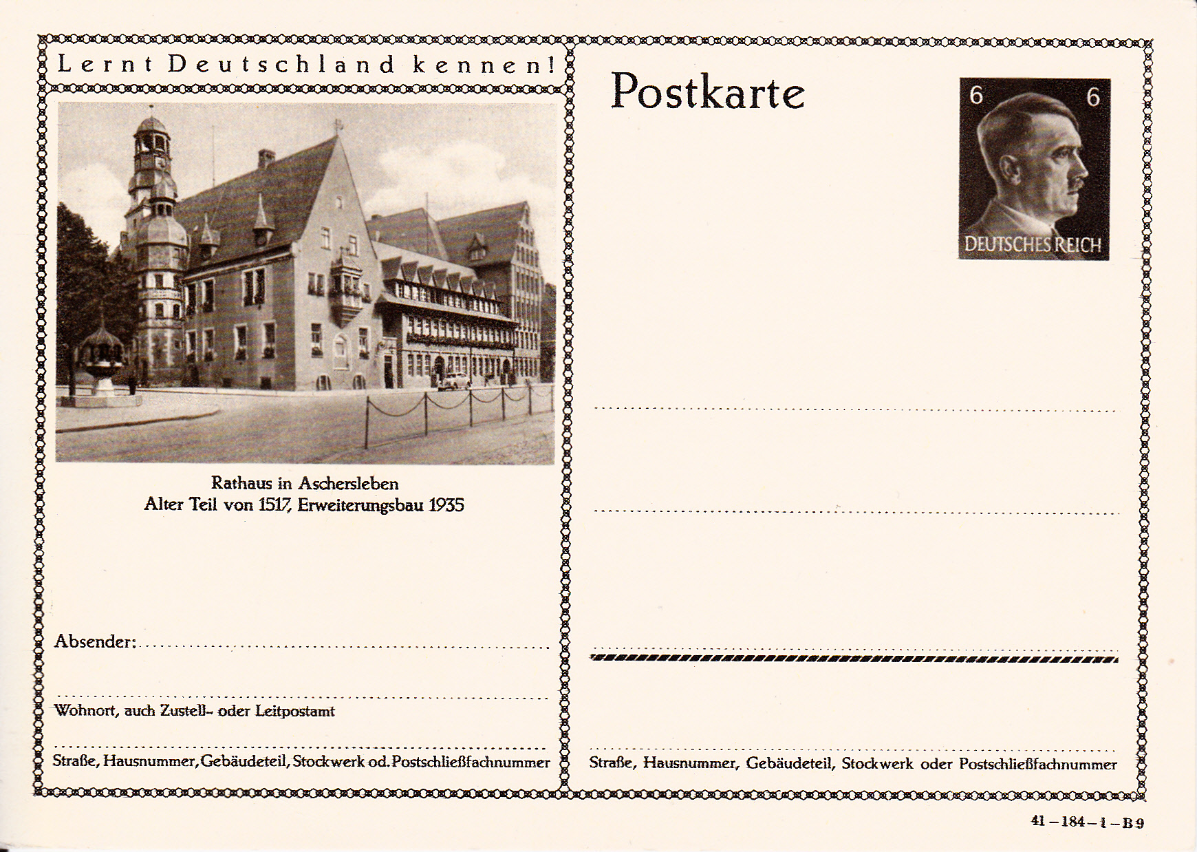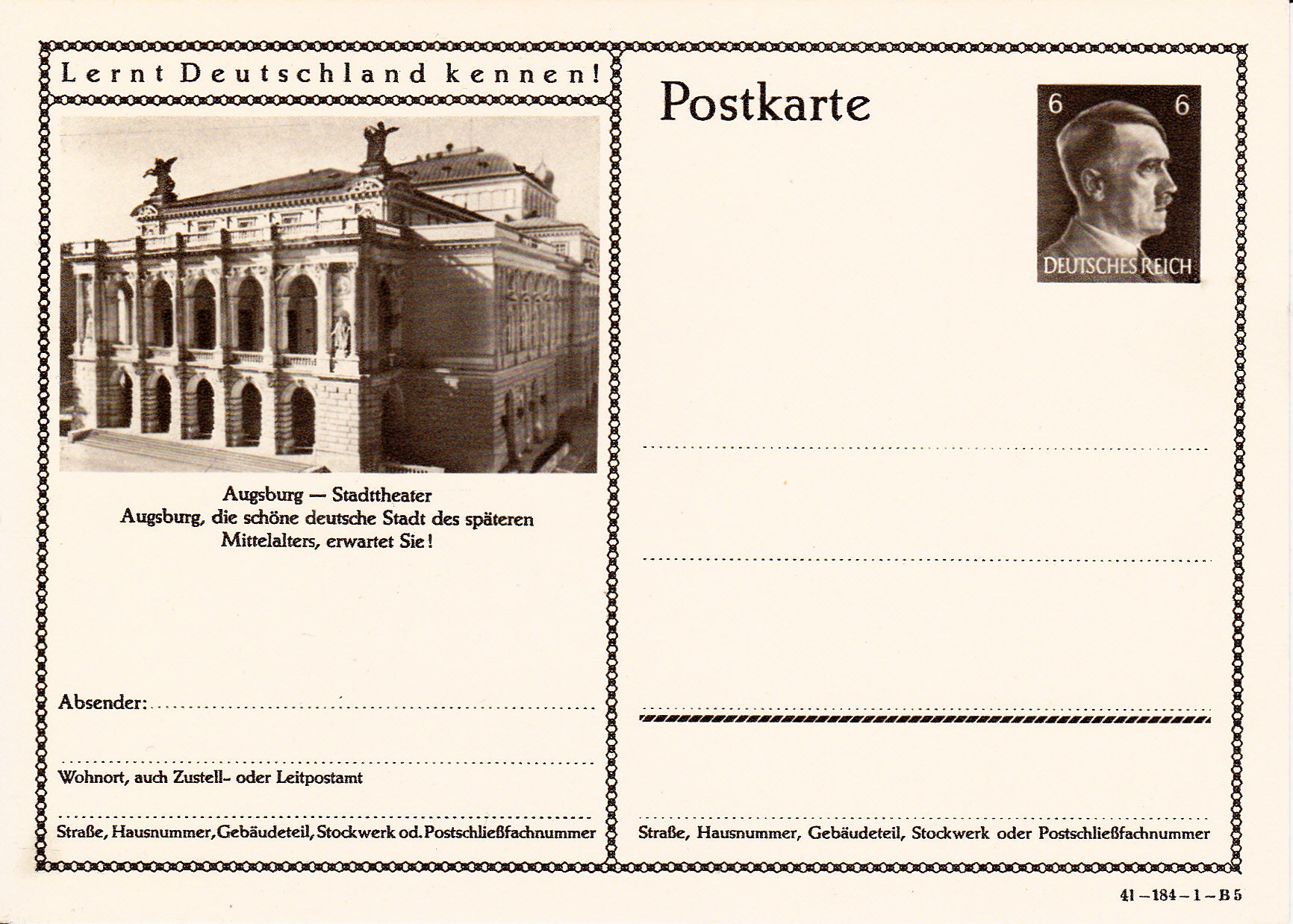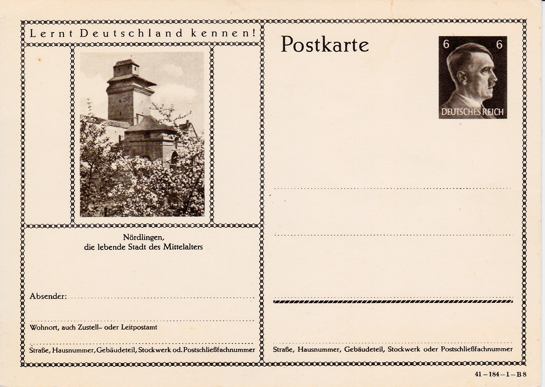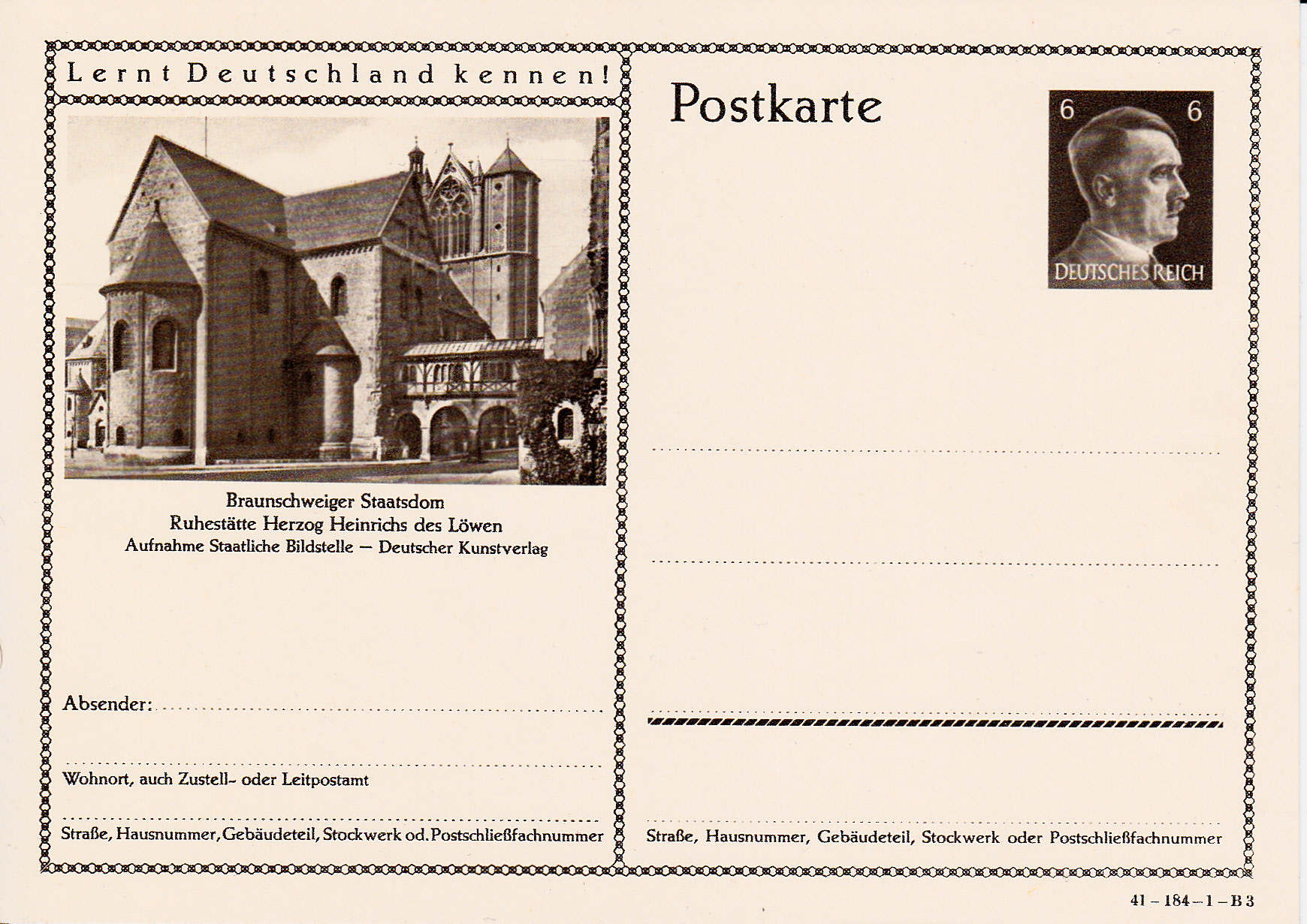 Ich beginne mit der Karte mit dem Druckvermerk 41-184-1-B1 (Ausgabejahr 1941-Serie 184-Druckplatte 1-Bild 1; bei weiteren Karten nenne ich jeweils die Serie und die Bildnummer, die Druckplattennummer nur, wenn es verschiedene Druckplattennummern bei der jeweiligen Serie gibt).