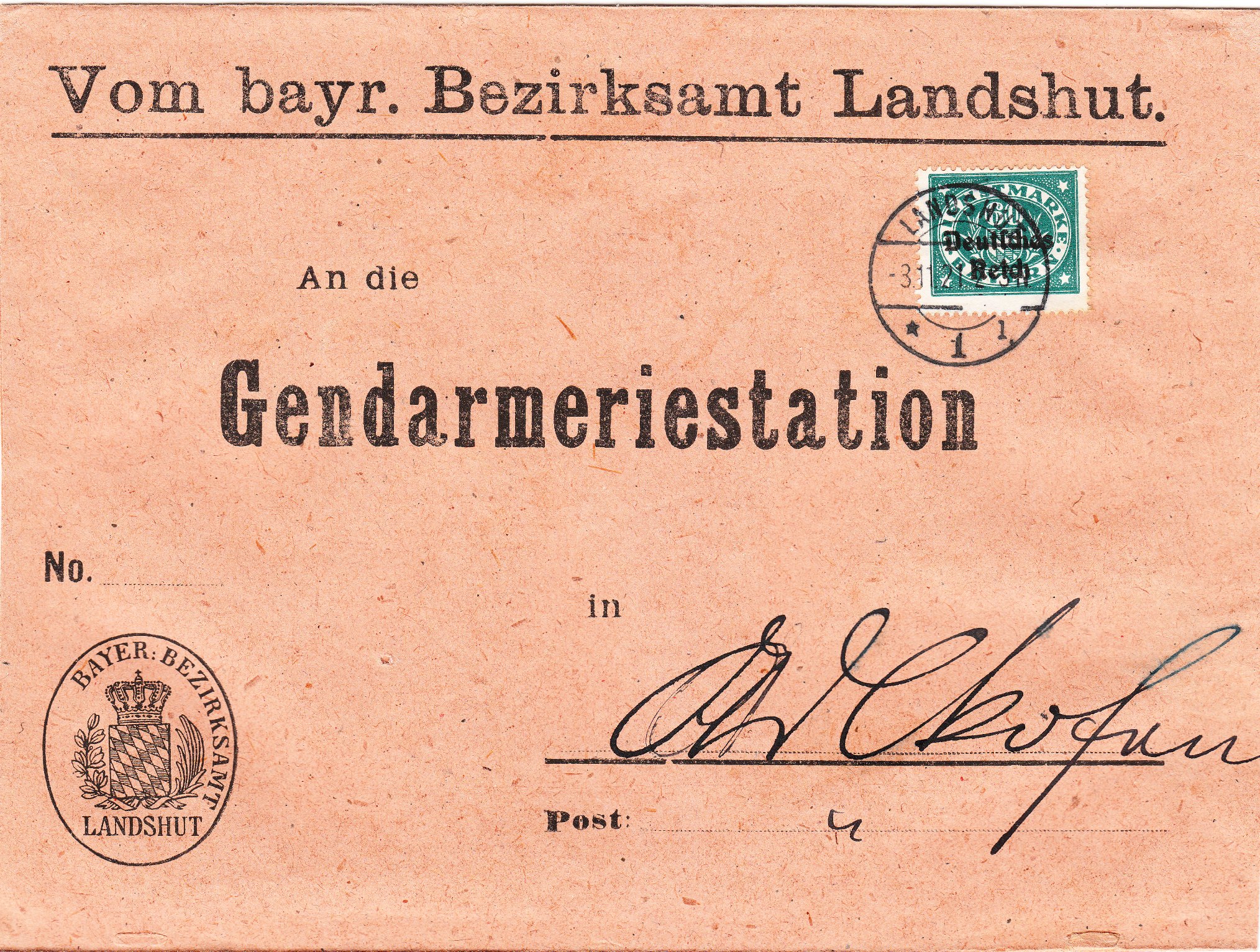 Hier zur Einstimmung ein Dienstbrief als Vordruck "Vom bayr. Bezirksamt Landshut" bzw. mit aptiertem eingedruckten Siegel "BAYER. BEZIRKSAMT LANDSHUT", aus dem das "KÖNIGL." nach Ende der Monarchie entfernt worden war, sowie mit vorgedruckter Teiladresse "An die Gendarmeriestation in ... Post ...", hier handschriftlich ergänzt um "Adlkofen":