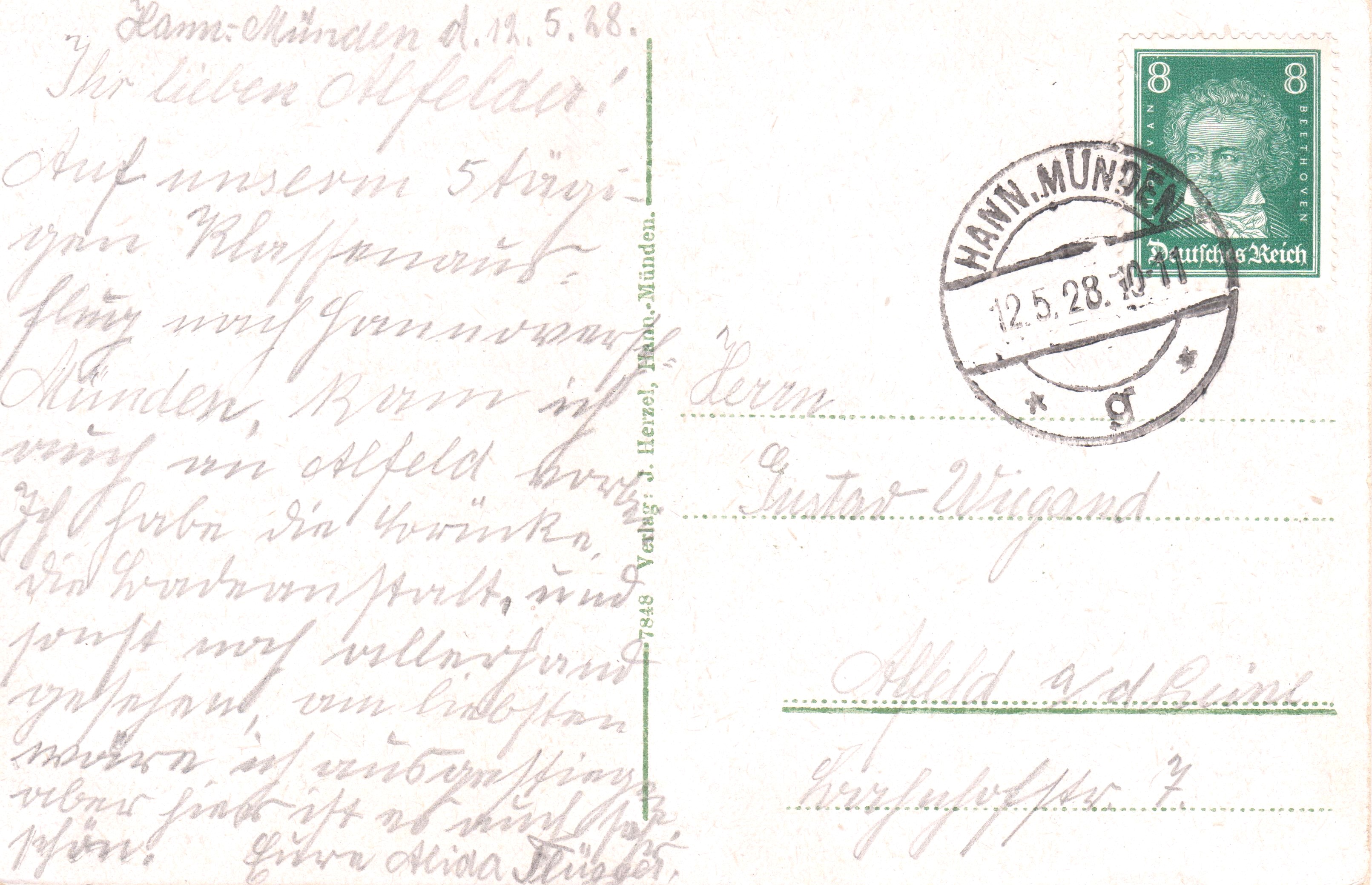 Einzelfrankatur 8 Pf am 12.05.1928 portogerecht auf Postkarte im Fernverkehr von HANN.MÜNDEN nach Alfeld: