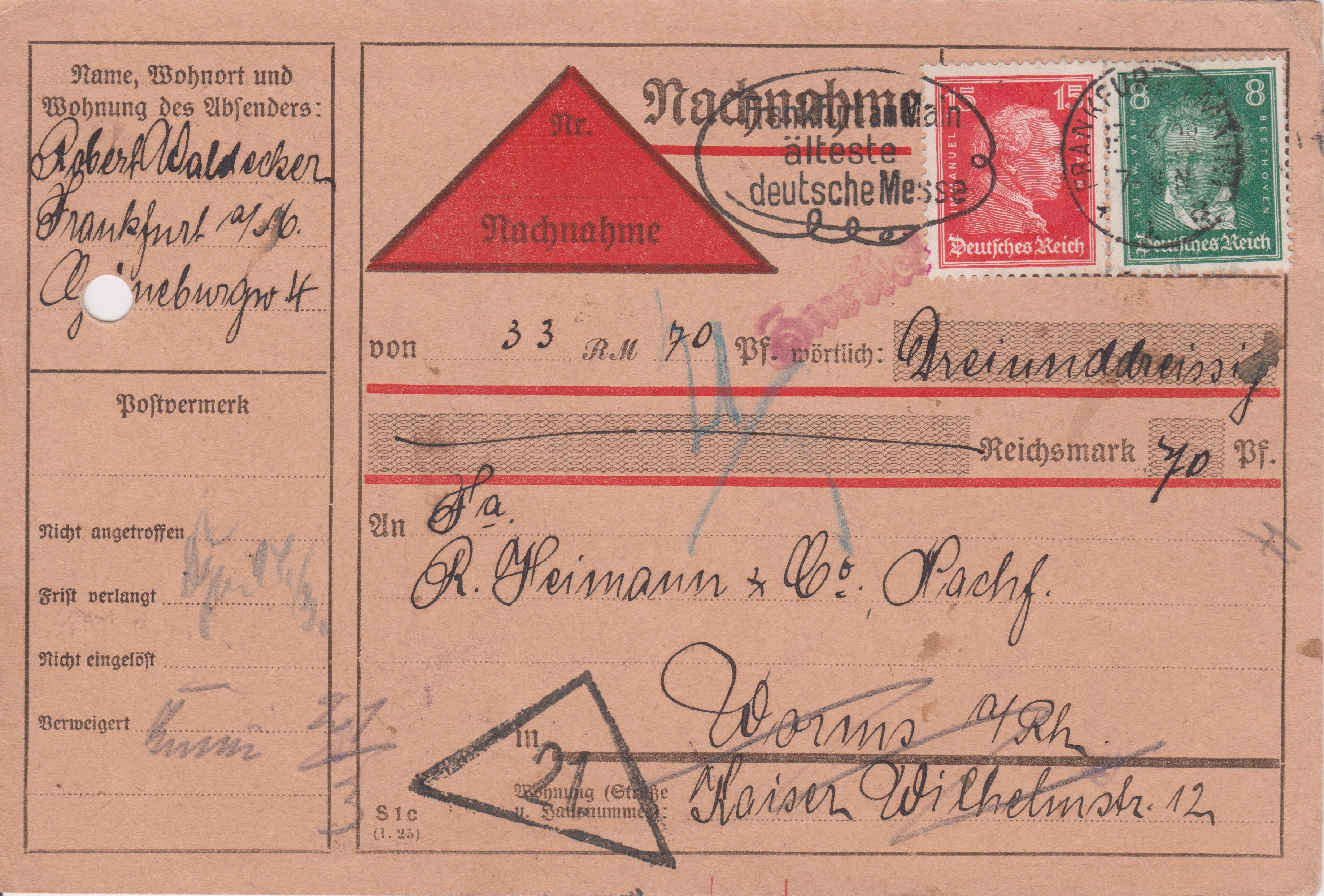 Drucksachen in Kartenform, Porto 3 Pf, per Nachnahme, Porto 20 Pf, ergibt die Portostufe 23 Pf, hier dargestellt als Mischfrankatur der Freimarken Berühmte Deutsche, Wertstufen 15 Pf sowie 8 Pf: