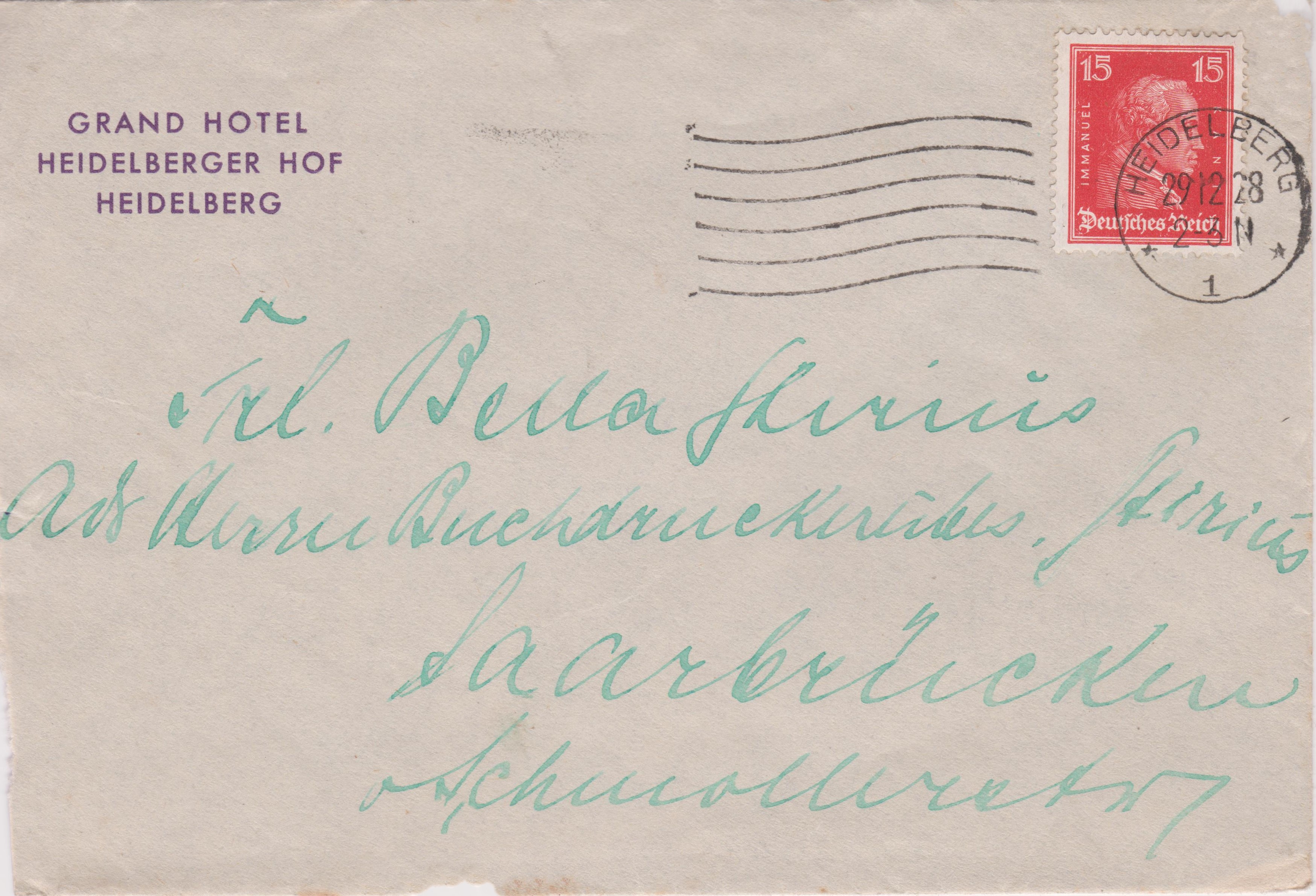 Einzelfrankatur 15 Pf IMMANUEL KANT am 29.12.1928 portogerecht auf Brief im Fernverkehr von HEIDELBERG nach Saarbrücken:
