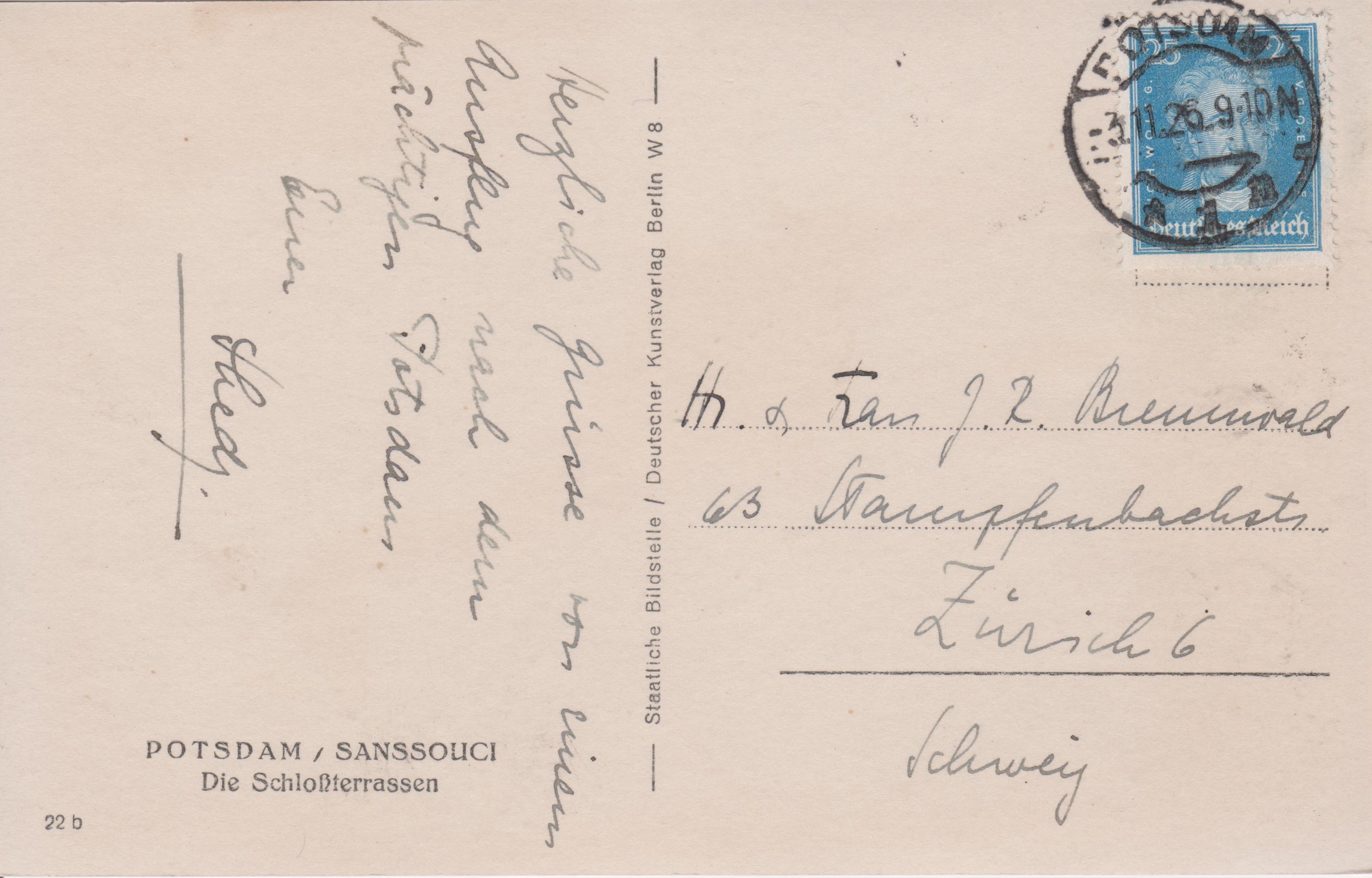 Einzelfrankatur 25 Pf am 03.11.1926 auf Postkarte von POTSDAM nach Zürich in der Schweiz: