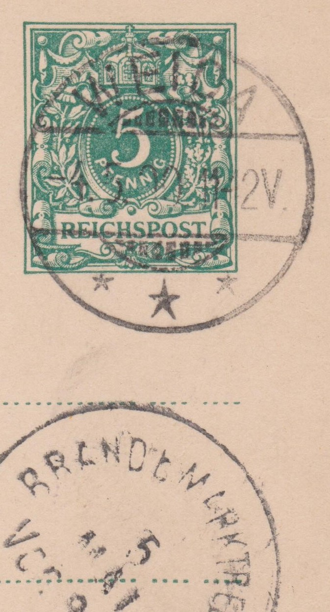 Ganzsache mit Wasserzeichen 95 C, Deutsches Reich P 36 I mit Eindruck 5 Pf Freimarken Wertziffer und Krone im Perlenoval, mit Punktlücke r 5+10: