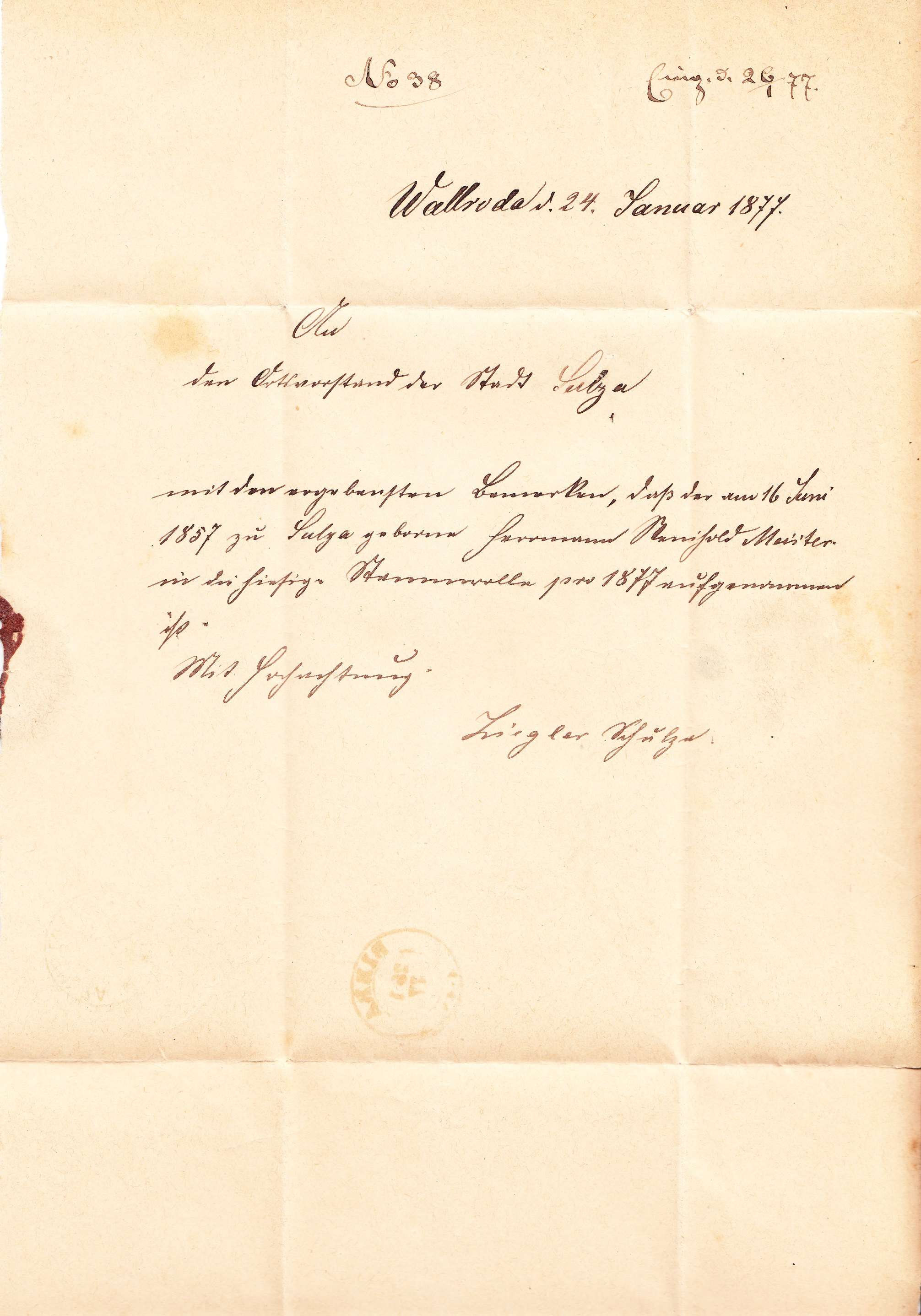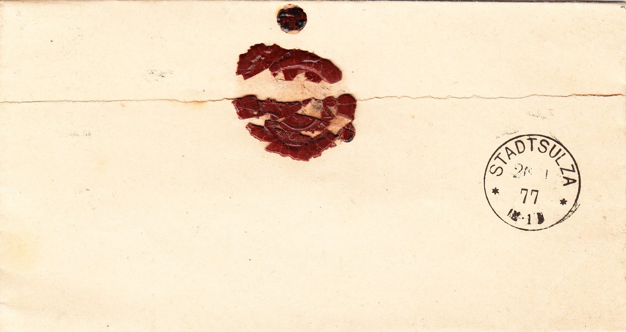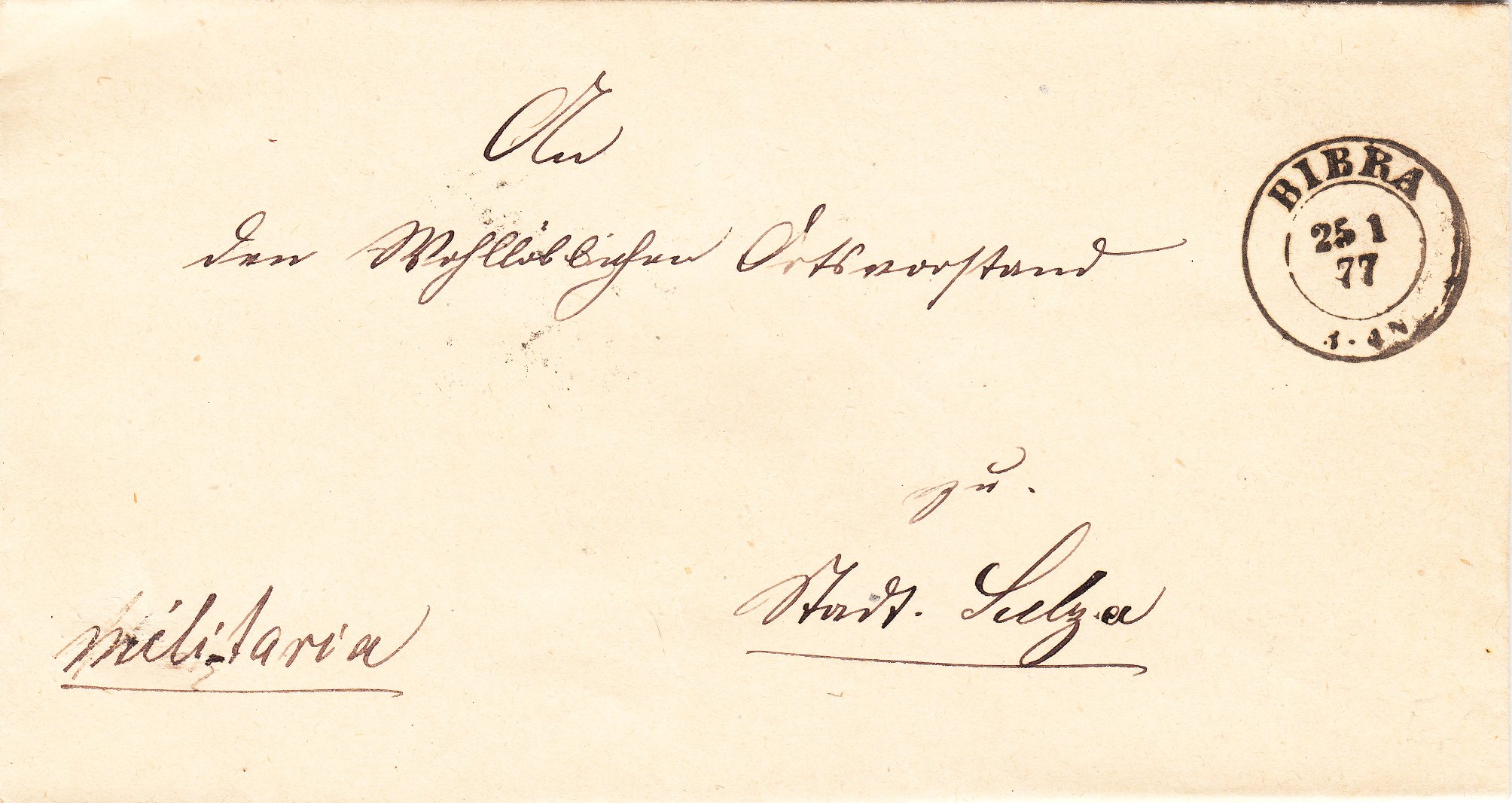 Portofreiheit genossen im Deutschen Reich "Militaria"-Sendungen wie diese nach Stadtsulza adressierte, die am 25.01.1877 in Bibra aufgegeben wurde: