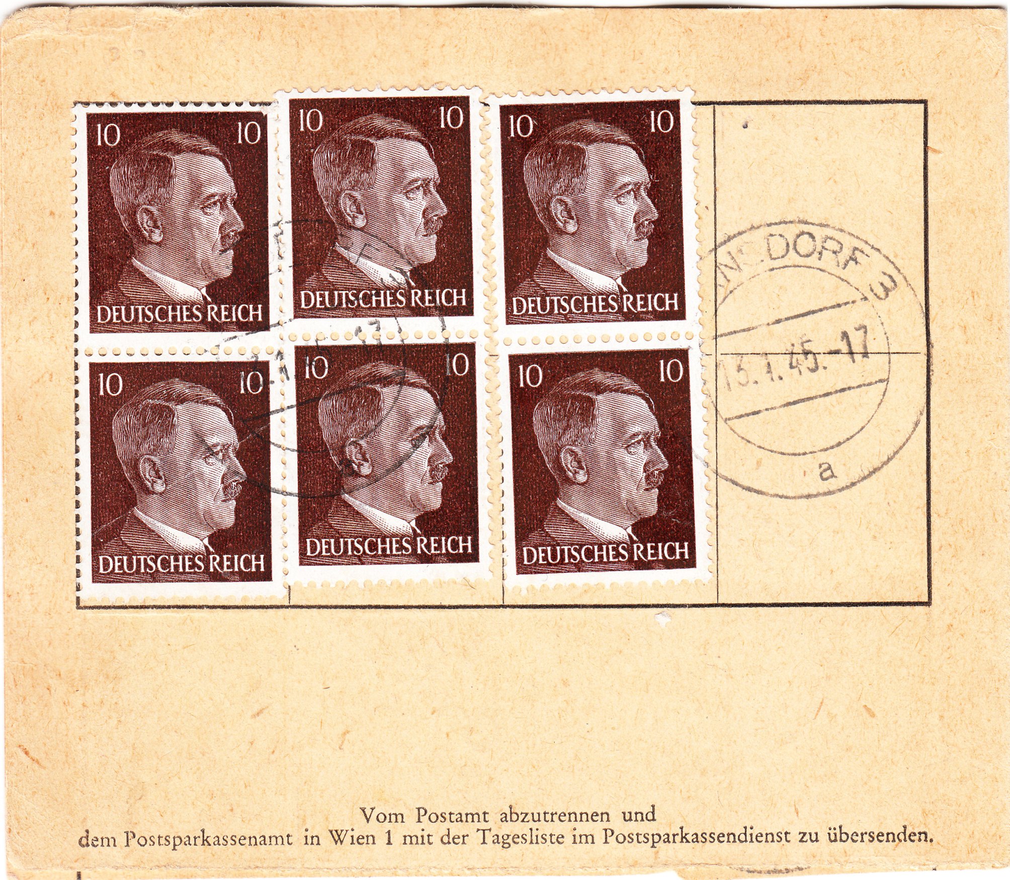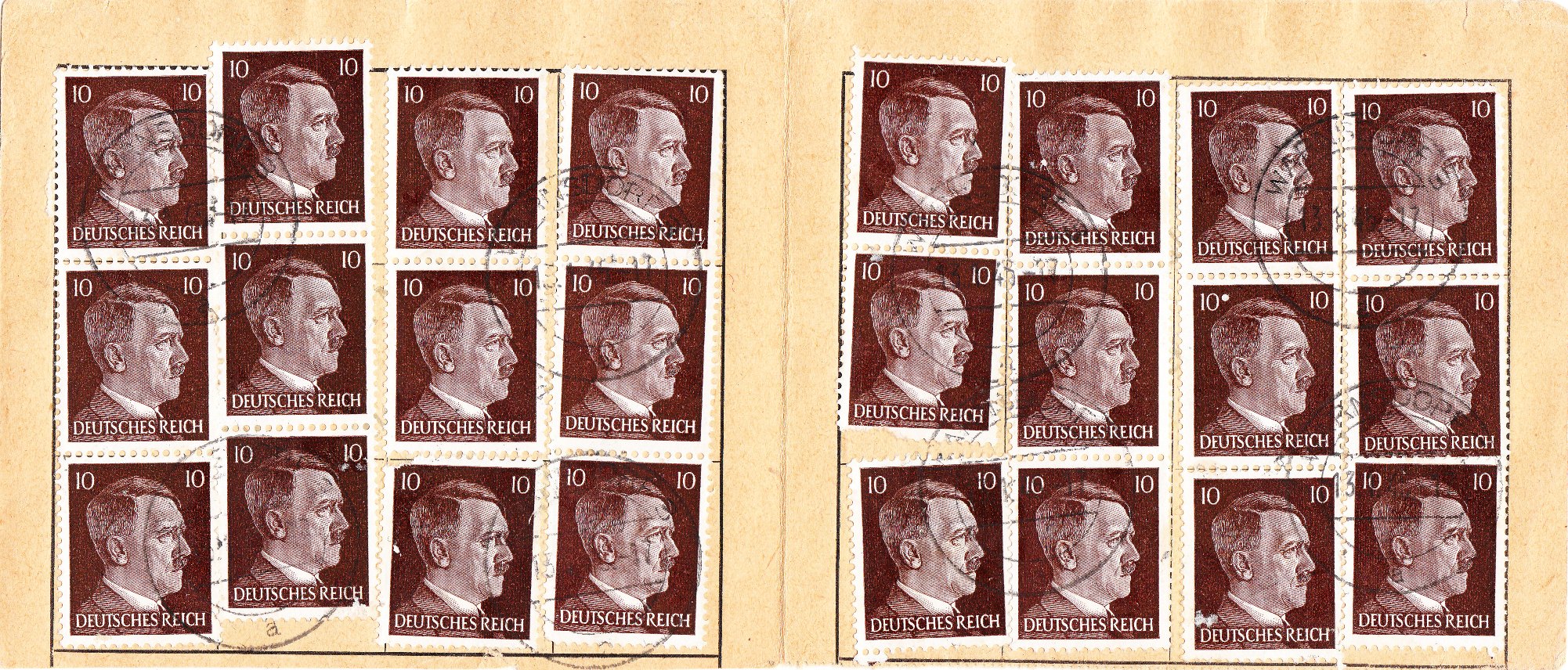 Diese Karten mußten wie bei diesen Beispiel zu sehen mit Postwertzeichen im Nennwert von insgesamt 3 Reichsmark beklebt werden. In diesem Falle handelt es sich um eine Mehrfachfrankatur von 30 Werten zu 10 Pfennig der Dauerserie Adolf Hitler, verklebt am 13.01.1945 in WARNSDORF 3.