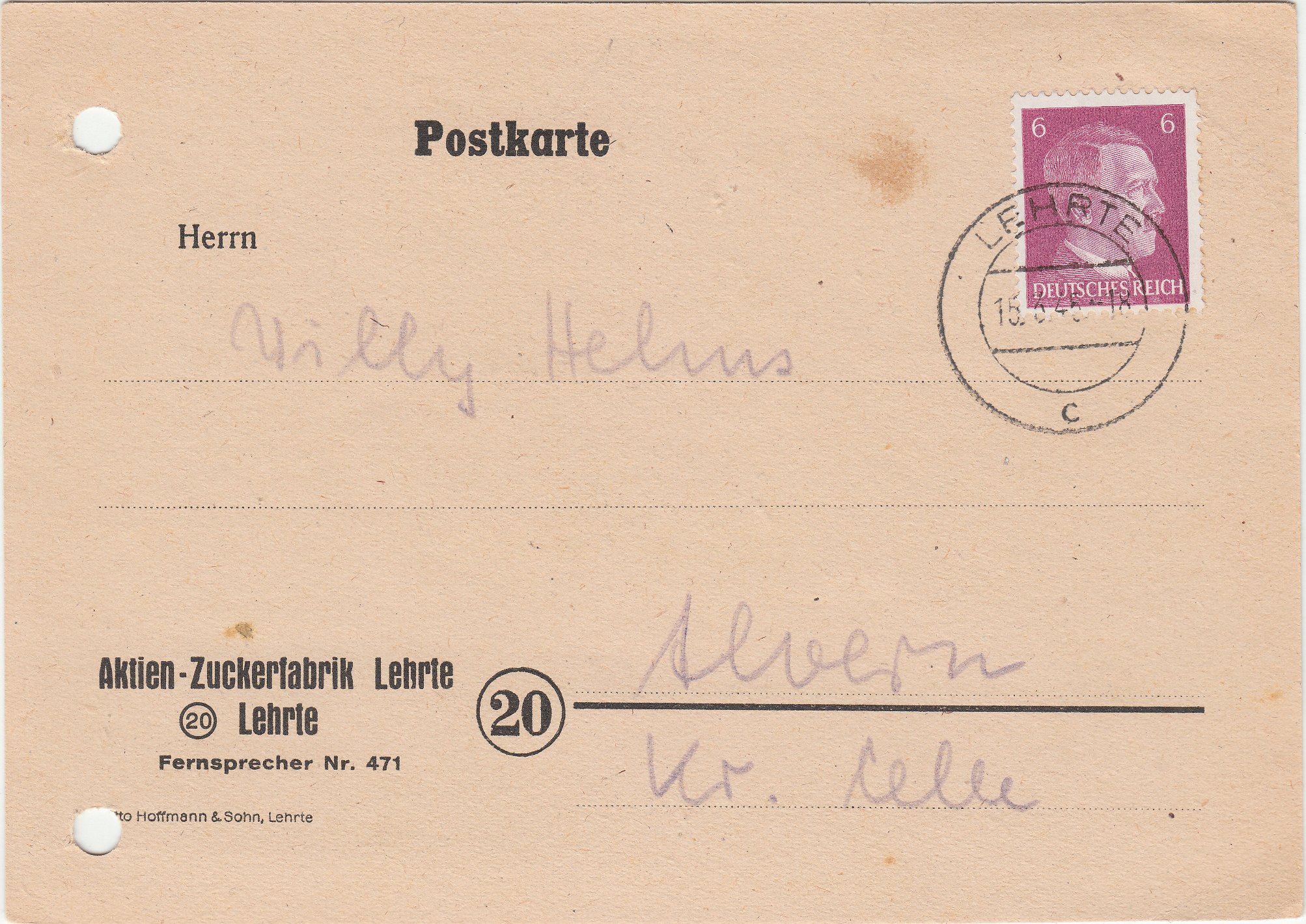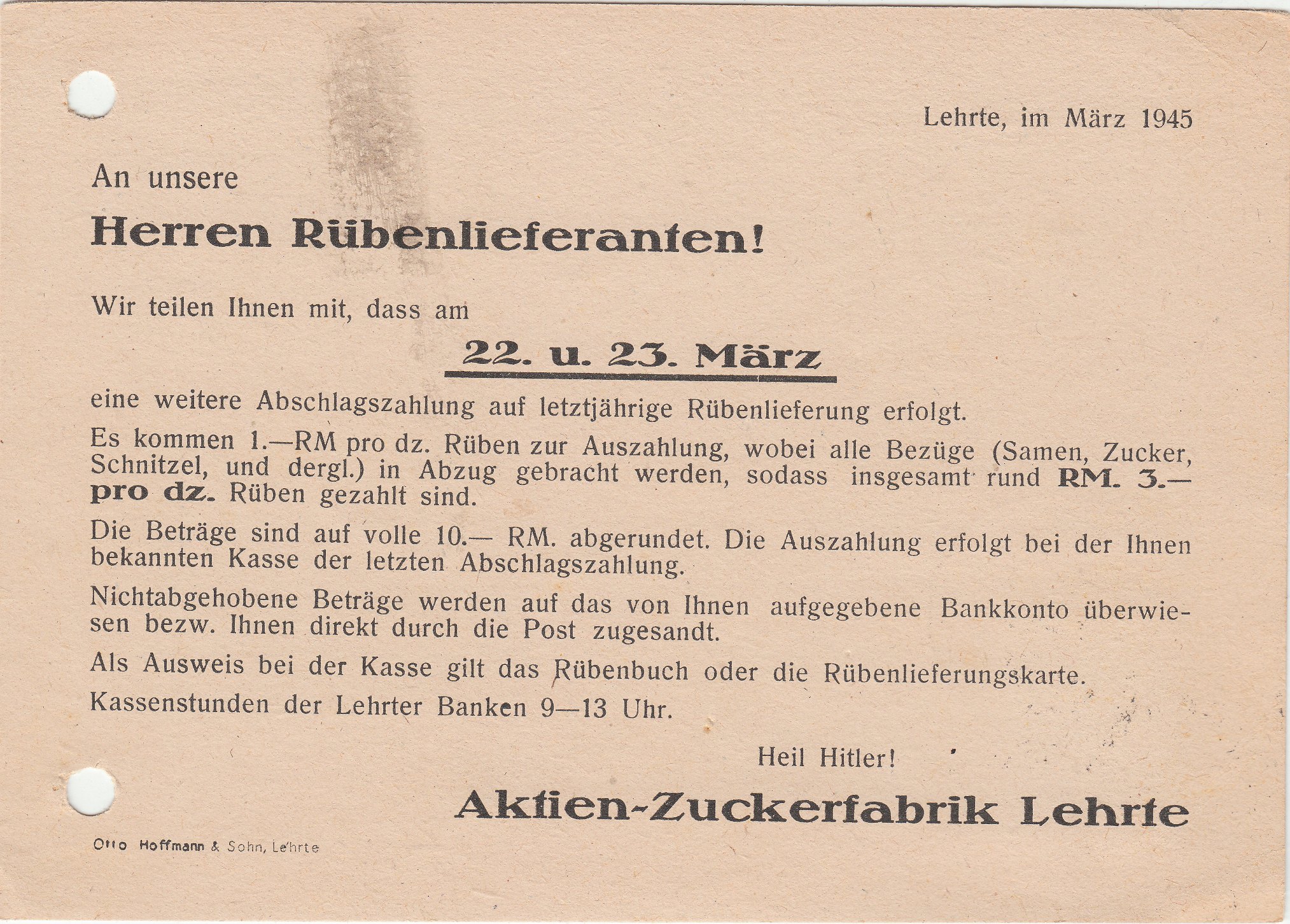 Diese Postkarte wurde am 15.03.1945 von der Zuckerfabrik in Lehrte an einen ihrer Rübenlieferanten geschickt:
