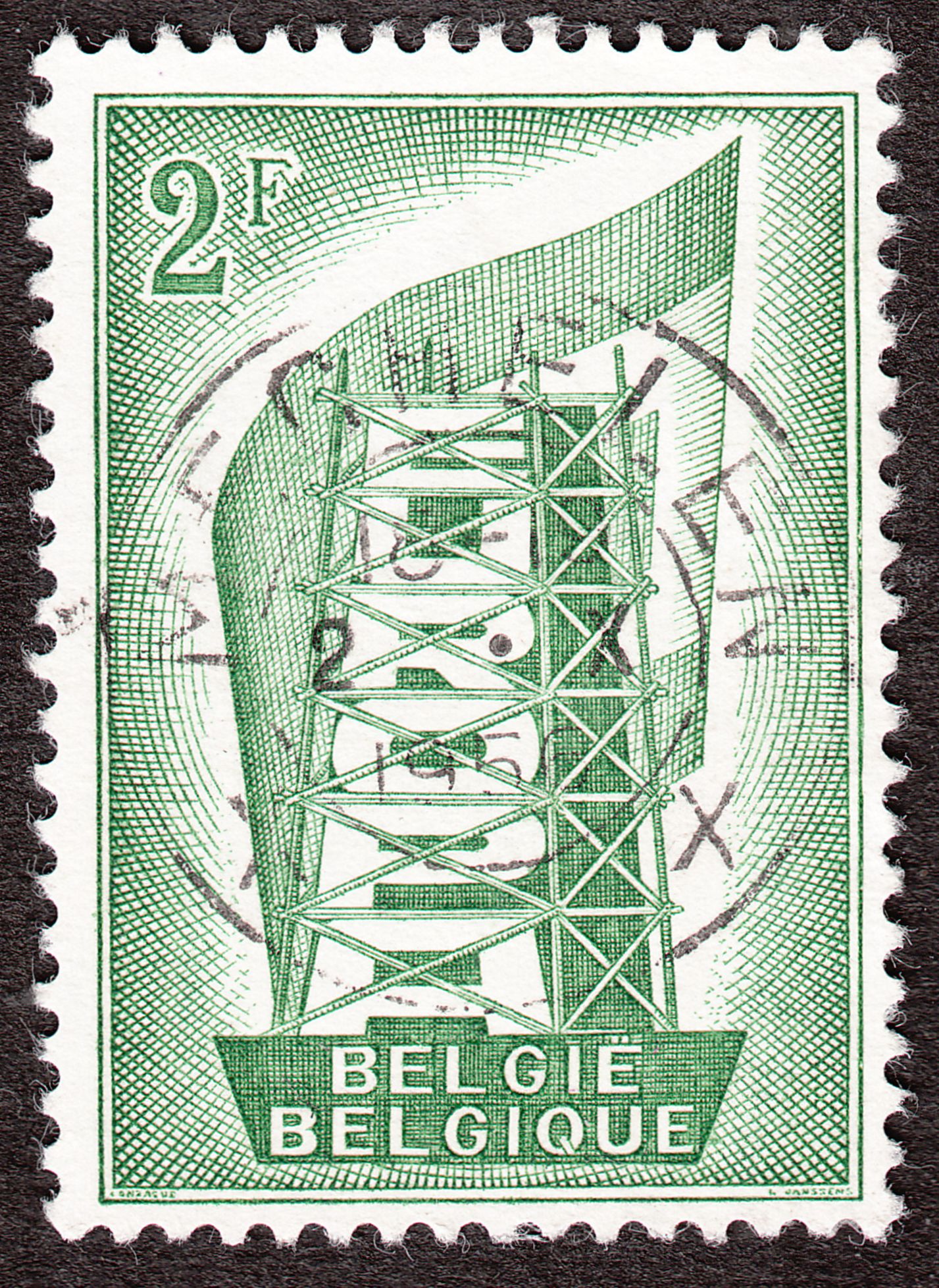 Hier ein gestempeltes Exemplar der Europamarke 1956 aus Belgien der Wertstufe zu 2 F, katalogisiert als MiNr. 1043: