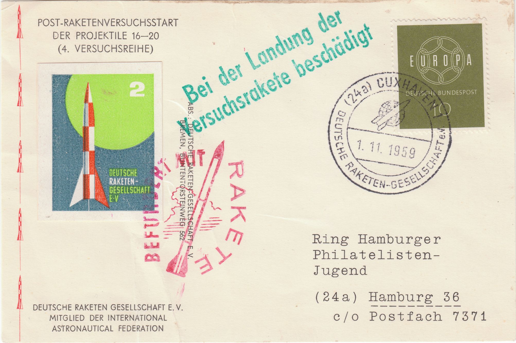 EF am 01.11.1959 portorichtig auf Postkarte im Fernverkehr von Cuxhaven nach Hamburg, befördert per Versuchsrakete und laut Hinweisstempel "Bei der Landung der Versuchsrakete beschädigt":