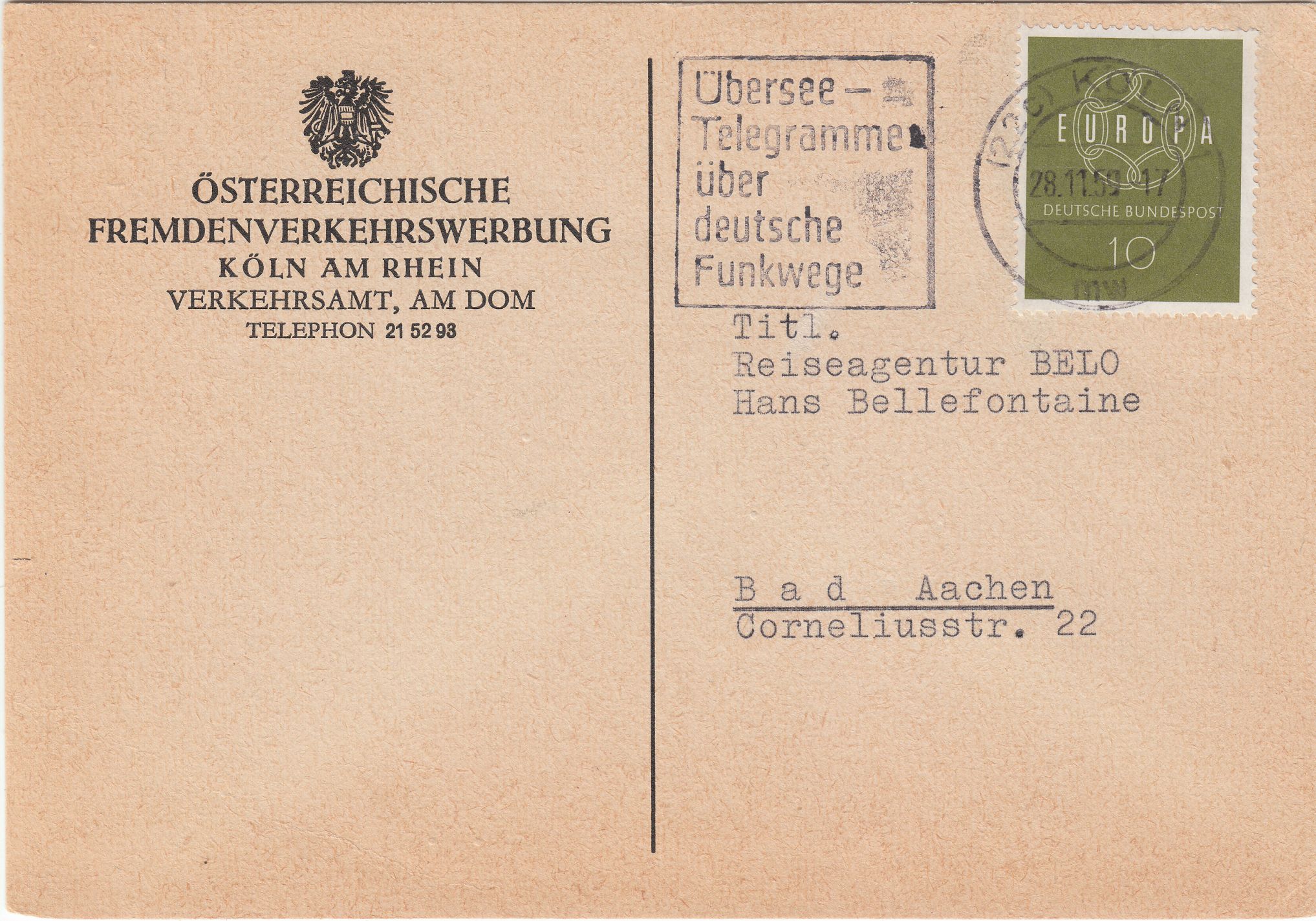 Interessant finde ich den Werbeeinsatz des Maschinenstempels "Übersee- Telegramme über deutsche Funkwege". Hierbei handelt es sich um den Maschinen-Serienstempel, katalogisiert als Bochmann Nr. S 914 mit einem Einsatzzeitraum von 1959 bis 1960 in 27 Orten, hier aus KÖLN 1.