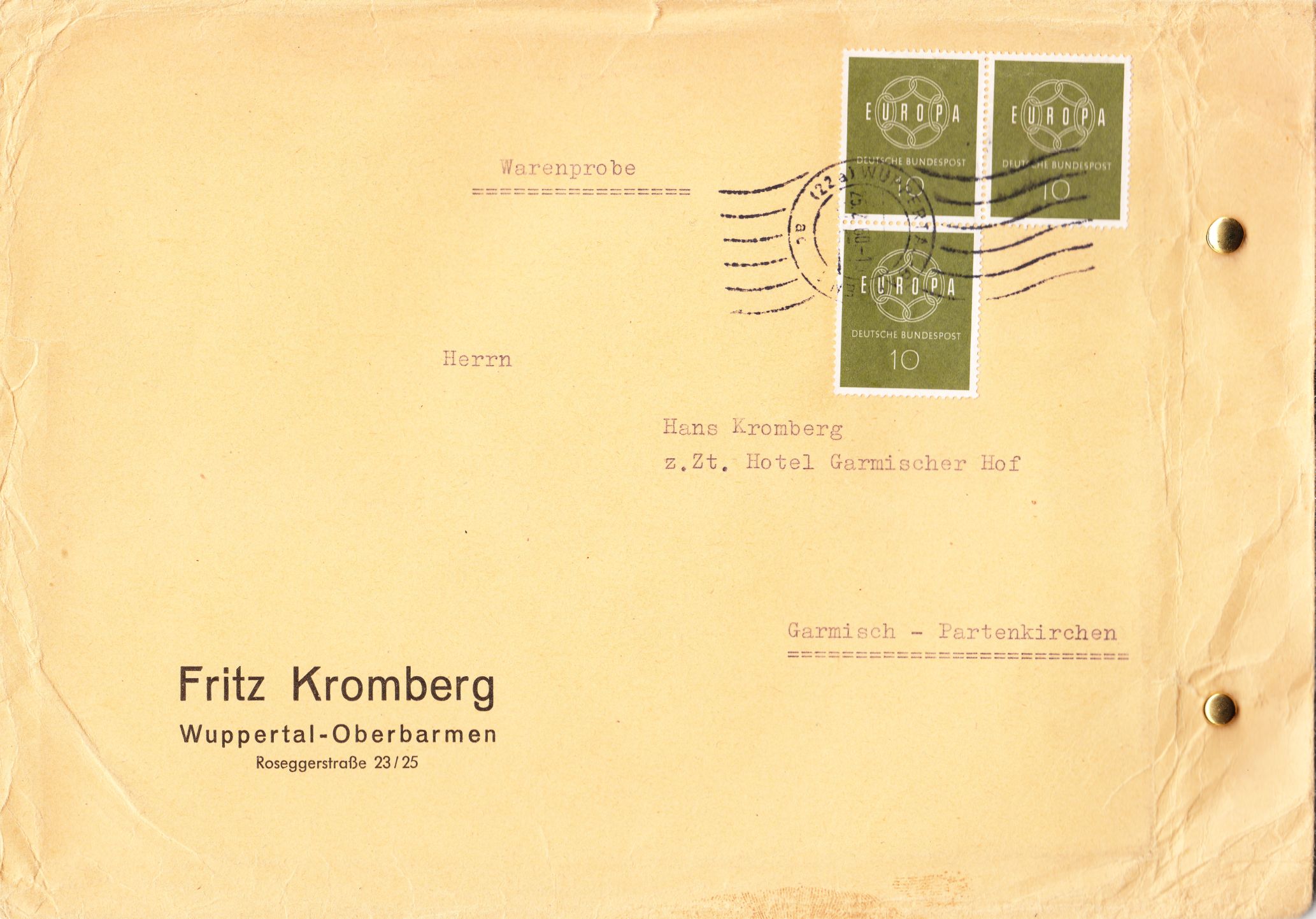 Hier eine nicht so häufig zu findende Sendungsart "Warenprobe", am 25.02.1960 frankiert mit drei Exemplaren der Europamarke 1959 in der Wertstufe zu 10 Pfennig: