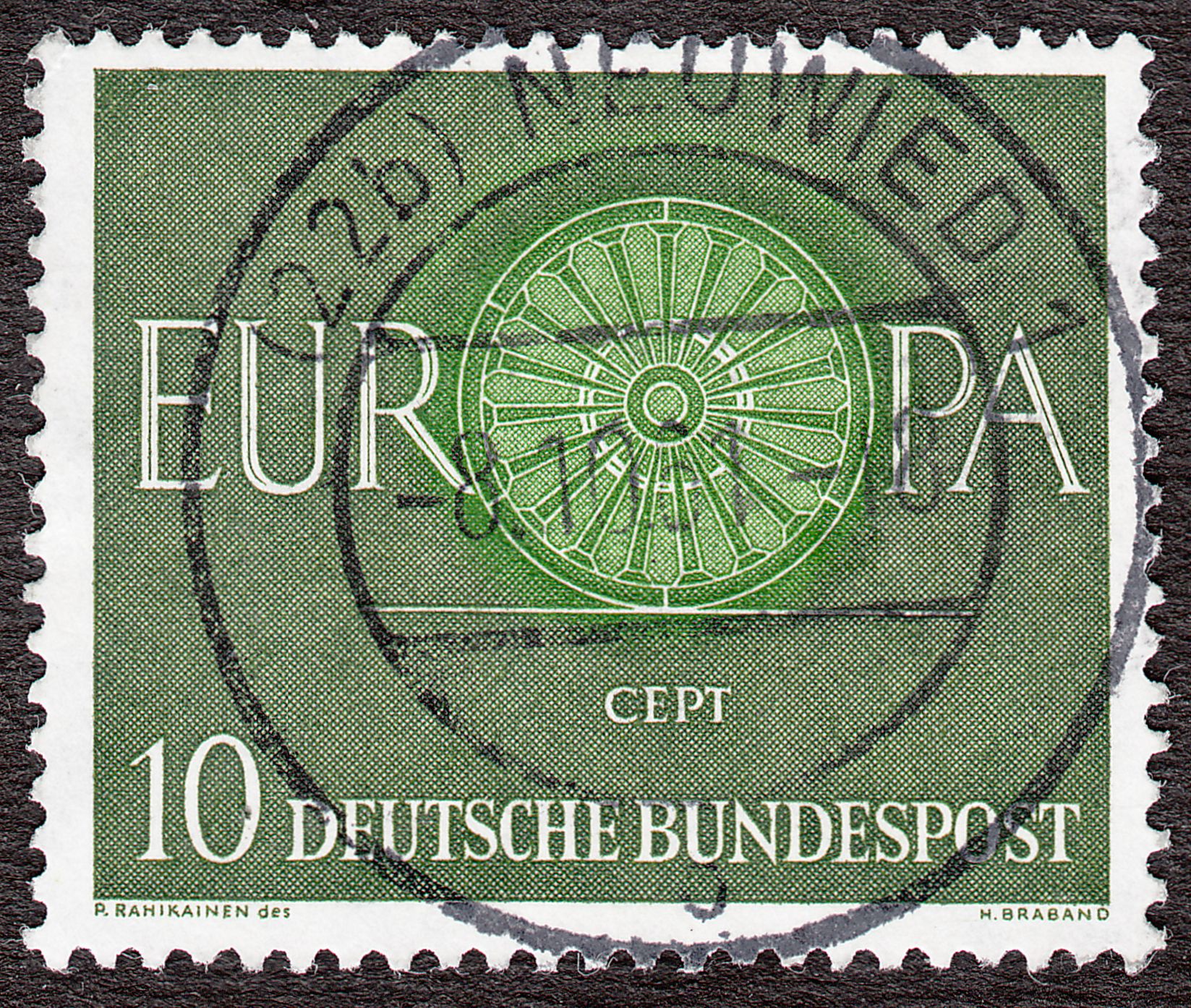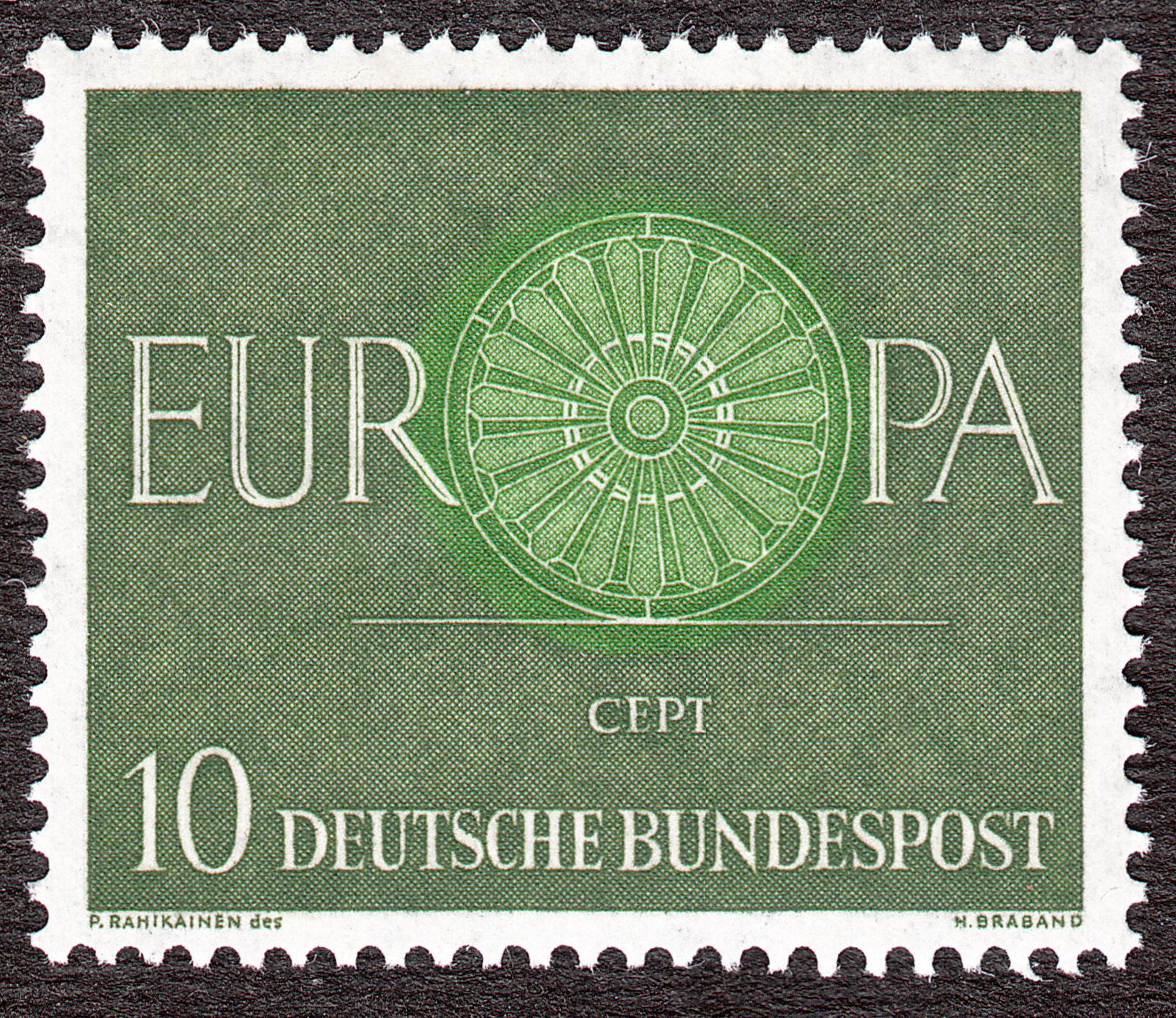 1960 erschienen die Europamarken erstmals als offizielle "Europa CEPT Ausgabe". Aus diesem Anlaß gaben 20 Länder insgesamt 36 Postwertzeichen heraus, mehr als doppelt soviele wie 1959! Gleich 11 Länder hatten 1960 ihre Premiere bezüglich der Ausgabe von Europamarken: Dänemark, Finnland, Großbritannien, Griechenland, Island, Irland, Liechtenstein, Norwegen, Portugal, Spanien und Schweden. Das gemeinsame Motiv war ein Speichenrad eines römischen Postwagens mit 19 Speichen, das von dem finnischen Künstler Pentti Rahikainen gestaltet wurde.