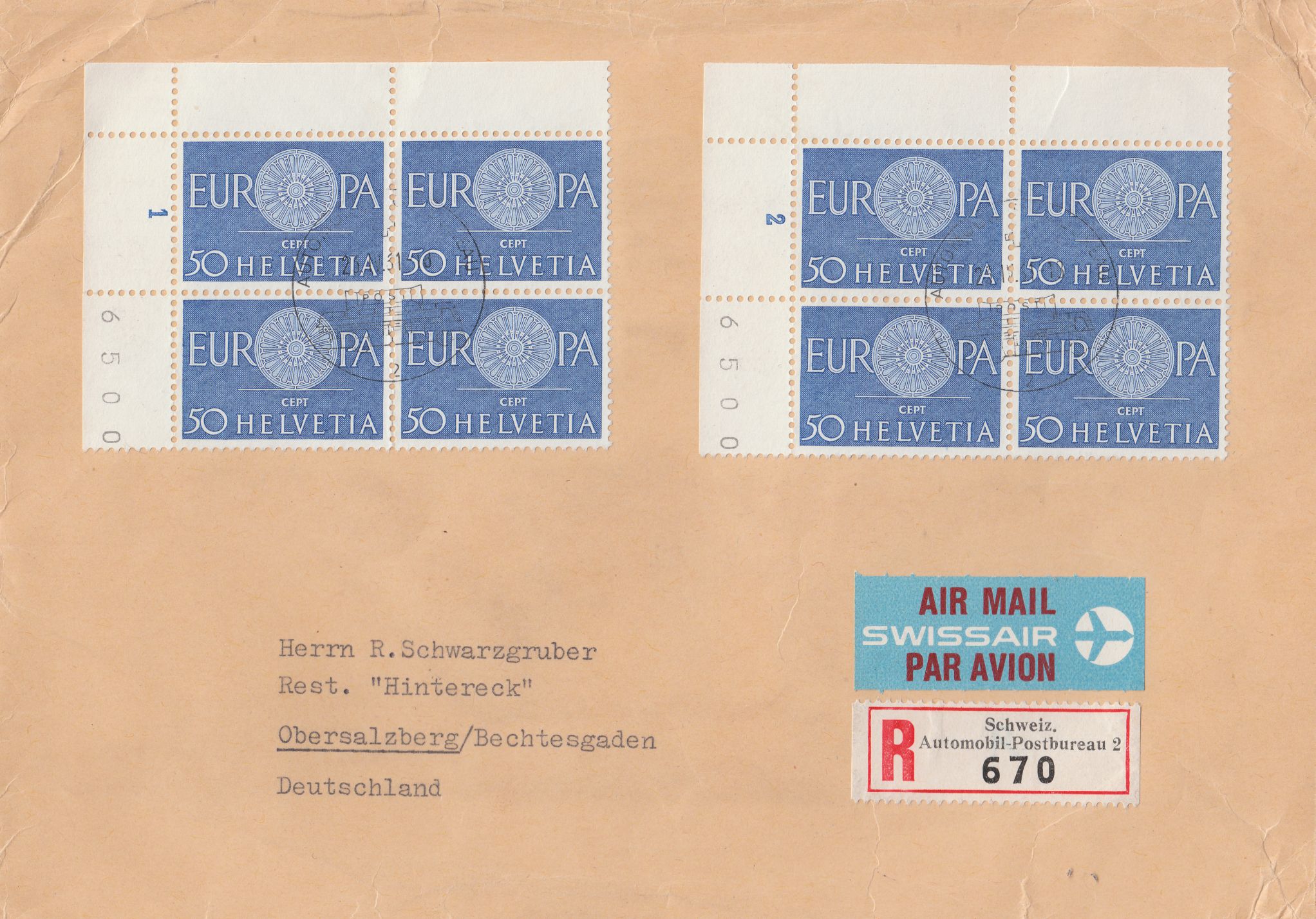 Zwei Viererblocks vom Eckrand 1 mit Bogenzählnummer "6500" und Plattennummer "1" bzw. "2" auf einem Einschreibebrief nach Deutschland, aufgegeben am 23.04.1961 beim "Schweiz. Automobil-Postbureau 2", wohl während der in Basel stattfindenden Mustermesse:
