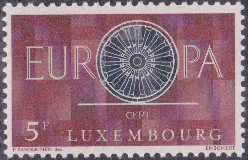 In Luxemburg erschienen die Europamarken 1960 am 19. September 1960. Hier die Marke zu 5 Fr braunkarmin/grünlichschwarz mit dem Gemeinschaftsmotiv "„O“ in „EUROPA“ als Wagenrad mit 19 Speichen", die in einer Auflage von 1 052 100 Stück erschienen ist.