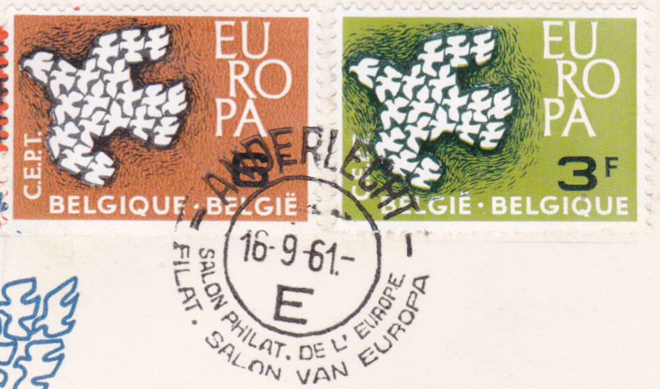 In Belgien erschienen die Europamarken 1961 am 16. September 1961. Hier die Marke zu 6 Francs hellorangebraun/schwarz mit dem Gemeinschaftsmotiv "Stilisierte Taube aus 19 Einzeltauben", die in einer Auflage von 3 552 851 Stück erschienen ist.