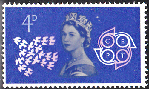 In Großbritannien erschienen die Europamarken 1961 am 18. September 1961. Hier die Marke zu 4 Pence mit dem Gemeinschaftsmotiv "Stilisierte Taube aus 19 Einzeltauben", dem CEPT-Emblem und Königin Elizabeth II., die in einer Auflage von 7 614 480 Stück erschienen ist.