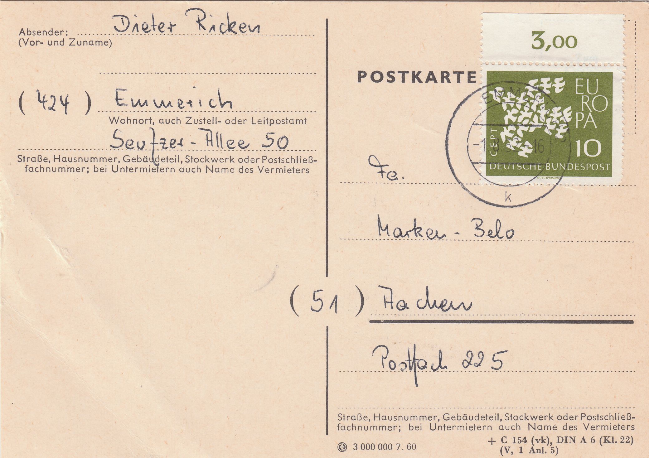 Am 15.02.1962 erschien in einer Auflage von 54.090.500 Stück diese Europamarke der Wertstufe 10 Pfennig, gedruckt in der Druckerei Bagel auf Papier mit Fluoreszenz, katalogisiert als MiNr. 367 y, hier als portorichtiger Brief im Ortsverkehr als FDC gelaufen: