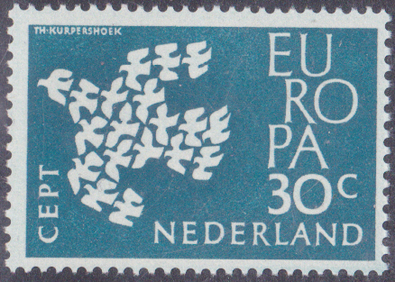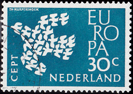 In den Niederlande erschienen die Europamarken 1961 am 18. September 1961. Hier die Marke zu 30 Cent grünlichblau mit dem Gemeinschaftsmotiv "Stilisierte Taube aus 19 Einzeltauben", die in einer Auflage von 5 265 500 Stück erschienen ist.