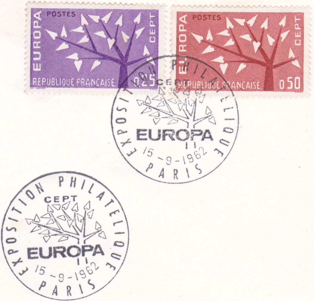 1962 erschien die erste Europamarke in Monaco. Einheitliches Motiv war ein vom Künstler Lex Weyer aus Luxemburg entworfener "Stilisierter Baum mit 19 Blättern". Im Jahr 1962 gaben 18 Länder insgesamt 39 Europamarken aus.