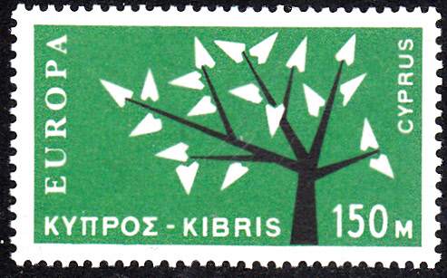 In Zypern erschienen die Europamarken 1962 wieder verspätet am 28. Januar 1963. Hier die Marke zu 150 Mills grün/schwarz mit dem Gemeinschaftsmotiv "Stilisierter Baum mit 19 Blättern", die in einer Auflage von 424 960 Stück erschien.