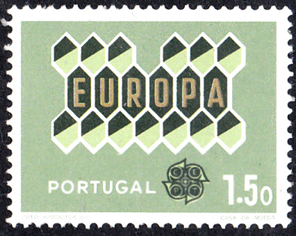 In Portugal erschienen die Europamarken 1962 am 17. September 1962 nicht mit dem Gemeinschaftsmotiv "Stilisierter Baum mit 19 Blättern", sondern mit dem Motiv "Bienenwaben mit Inschrift EUROPA" und dem CEPT-Emblem. Hier die Marke zu 1,50 Escudo, die in einer Auflage von 1 500 000 Stück erschien.
