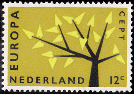 In den Niederlande erschienen die Europamarken 1962 am 17. September 1962. Hier die Marke zu 12 Cent mit dem Gemeinschaftsmotiv "Stilisierter Baum mit 19 Blättern", die in einer Auflage von 34 736 400 Stück erschien.