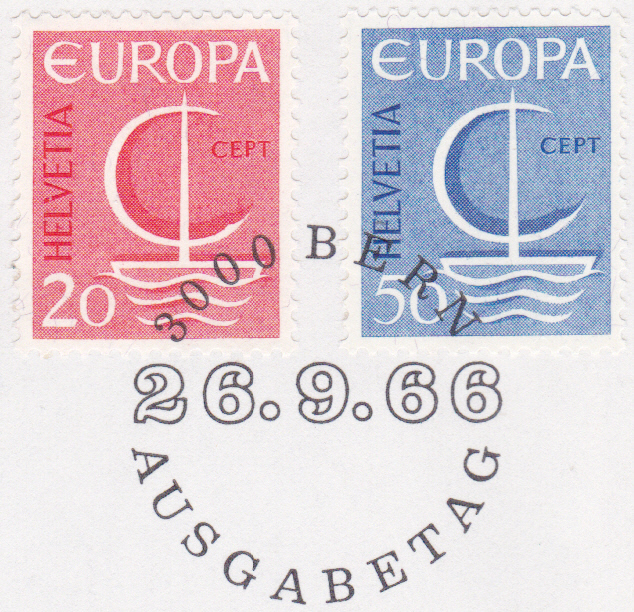 In der Schweiz erschienen die Europamarken 1966 am 26. September 1966. Hier eine postfrische Marke zu 20 Rappen dunkelrosa mit dem Gemeinschaftsmotiv "Stilisiertes Boot mit geblähtem Segel und Inschrift „CEPT“", die in einer Auflage von 22 379 000 Stück erschien.