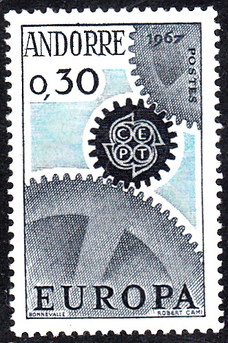 Bei der französischen Post in Andorra erschienen die Europamarken 1967 am 29. April 1967. Hier eine postfrische Marke zu 0.30 (Fr) hellblau/dunkelblau mit dem Gemeinschaftsmotiv "Ineinandergreifende Zahnräder, Antriebsrad mit CEPT-Emblem", die in einer Auflage von 800 000 Stück erschien.