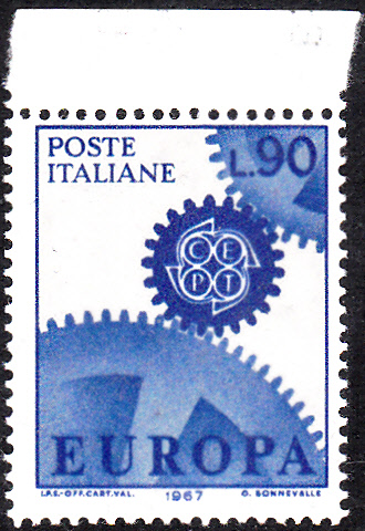 In Italien erschienen die Europamarken 1967 am 10. April 1967. Hier die Marke zu 90 Lire violettultramarin/ hellrahmfarben mit dem Gemeinschaftsmotiv "Ineinandergreifende Zahnräder, Antriebsrad mit CEPT-Emblem", die in einer Auflage von 15 000 000 Stück erschien.