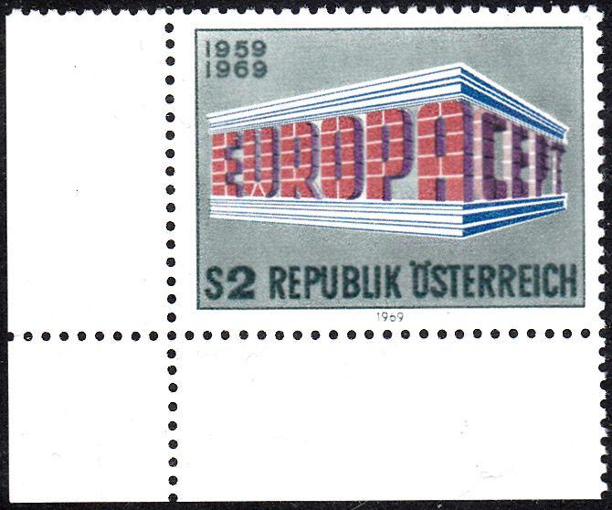In Österreich erschien eine Europamarke 1969 am 28.April 1969. Hier ein Eckrandstück der Marke zu 2 Schilling mit dem Gemeinschaftsmotiv "„EUROPA“ und „CEPT“ in Tempelform", die in einer Auflage von 3 000 000 Stück erschien.