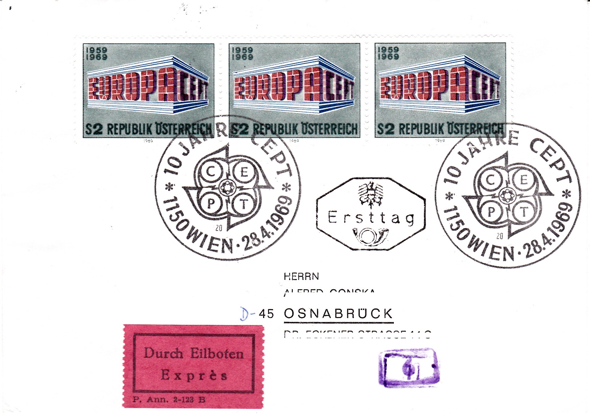 Auf diesem Brief per Eilboten von Wien nach Osnabrück wurden vorderseitig und rückseitig insgesamt fünf Marken der Europamarke 1969 verklebt und am Ersttag mit dem Ersttagsonderstempel entwertet. Auf der Rückseite wurde auch ein Ankunftsstempel in Osnabrück angebracht.
