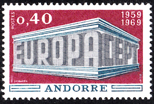 Bei der französischen Post in Andorra erschienen die Europamarken 1969 am 27. April 1969. Hier eine Marke zu 0.40 Fr mit dem Gemeinschaftsmotiv "„EUROPA“ und „CEPT“ in Tempelform", die in einer Auflage von 690 000 Stück erschien.