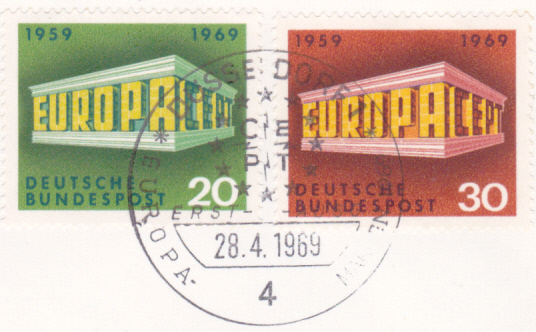Bei der Deutschen Bundespost erschienen die Europamarken 1969 am 28. April 1969. Hier eine Marke zu 20 Pfennig (MiNr 583) mit dem Gemeinschaftsmotiv "„EUROPA“ und „CEPT“ in Tempelform", die in einer Auflage von 50 000 000 Stück erschien.