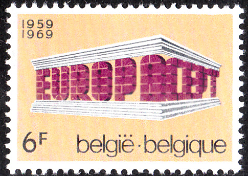 In Belgien sind die Europamarken 1969 am 26. April 1969 mit dem Gemeinschaftsmotiv "„EUROPA“ und „CEPT“ in Tempelform" erschienen. Hier der Wert zu 6 Francs, der in einer Auflage von 2 750 000 Stück erschien.