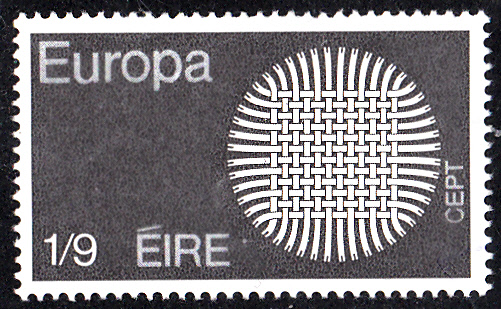 In Irland erschienen die Europamarken 1970 am 4. Mai 1970. Hier die Marke zu 1´9 Sc´Pg braunschwarz/silber mit dem Gemeinschaftsmotiv "Flechtwerk als Sonnensymbol", die in einer Auflage von 2 250 000 Stück erschien.