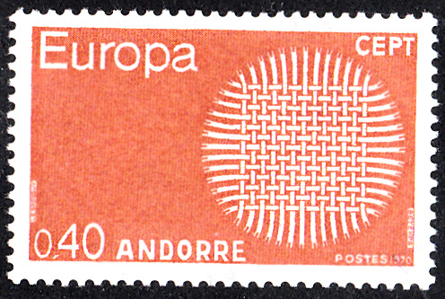 Bei der französischen Post in Andorra erschienen die Europamarken 1970 am 2. Mai 1970. Hier eine Marke zu 0.40 Fr orange mit dem Gemeinschaftsmotiv "Flechtwerk als Sonnensymbol", die in einer Auflage von 870 000 Stück erschien.