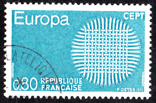 In Frankreich erschienen die Europamarken 1970 am 2. Mai 1970. Hier eine Marke zu 0,80 Fr helltürkisblau mit dem Gemeinschaftsmotiv "Flechtwerk als Sonnensymbol", die in einer Auflage von 15 900 000 Stück erschien.
