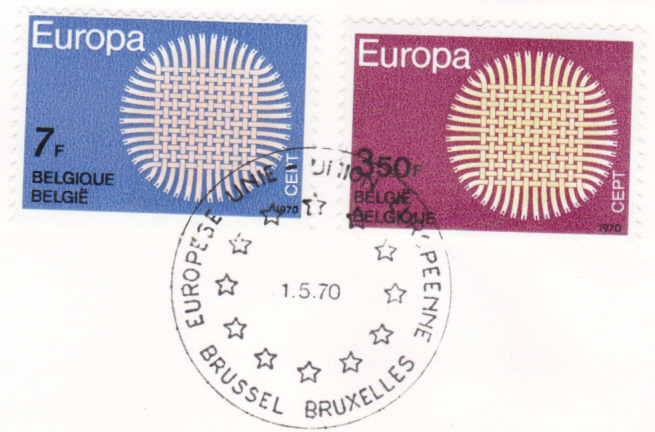 In Belgien erschienen die Europamarken 1970 am 1. Mai 1970. Hier die Marke zu 7 Francs mit dem Gemeinschaftsmotiv "Flechtwerk als Sonnensymbol", die in einer Auflage von 2 750 000 Stück erschien.