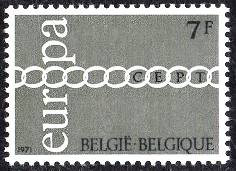 In Belgien erschienen die Europamarken 1971 am 1. Mai 1971. Hier die Marke zu 7 Francs schwarzolivgrün/ schwarz mit dem Gemeinschaftsmotiv "Brüderlichkeit und Zusammenarbeit durch Kette symbolisiert", die in einer Auflage von 2 750 000 Stück erschien.