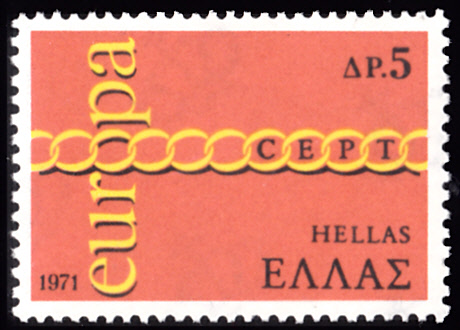 In Griechenland erschienen die Europamarken 1971 am 18. Mai 1971. Hier die Marke zu 5 Drachmen mit dem Gemeinschaftsmotiv "Brüderlichkeit und Zusammenarbeit durch Kette symbolisiert", die in einer Auflage von 845 297 Stück erschien.