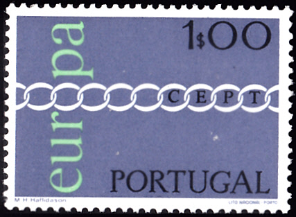 In Portugal erschienen die Europamarken 1971 am 3. Mai 1971. Hier die Marke zu 1,00 Escudo mit dem Gemeinschaftsmotiv "Brüderlichkeit und Zusammenarbeit durch Kette symbolisiert", die in einer Auflage von 9 000 000 Stück erschien.