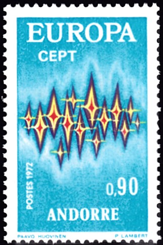 Bei der französischen Post in Andorra erschienen die Europamarken 1972 am 29. April 1972. Hier die Marke zu 0,90 Fr mit dem Gemeinschaftsmotiv "Sterne", die in einer Auflage von 600 000 Stück erschien.