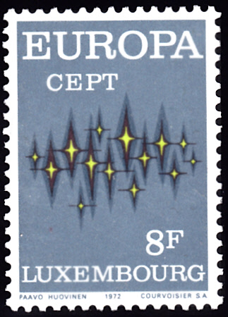 In Luxemburg erschienen die Europamarken 1972 am 2. Mai 1972. Hier die Marke zu 8 Fr mit dem Gemeinschaftsmotiv "Sterne", die in einer Auflage von 1 000 000 Stück erschien.